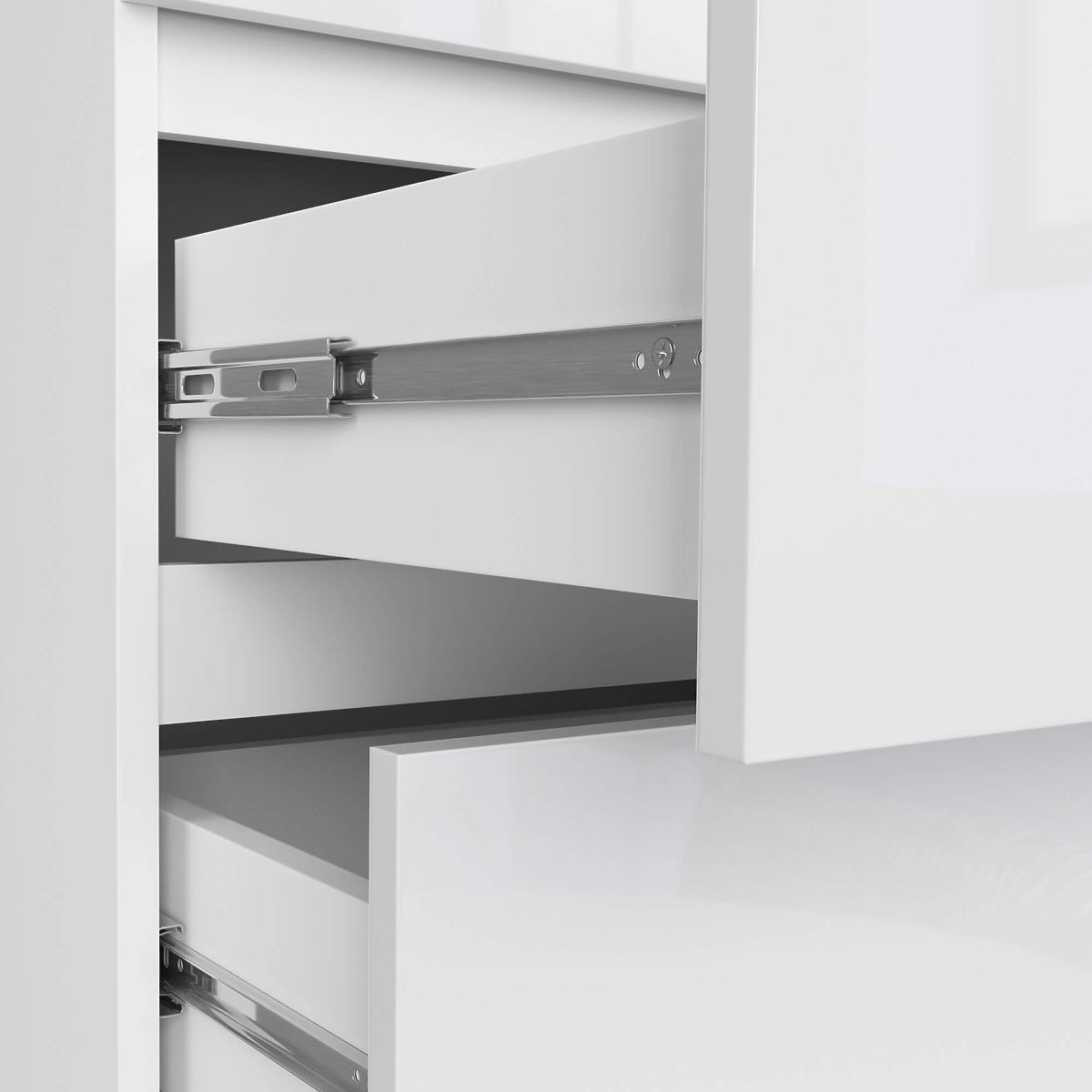 - Schubladen laufen auf Metallkugelführungen