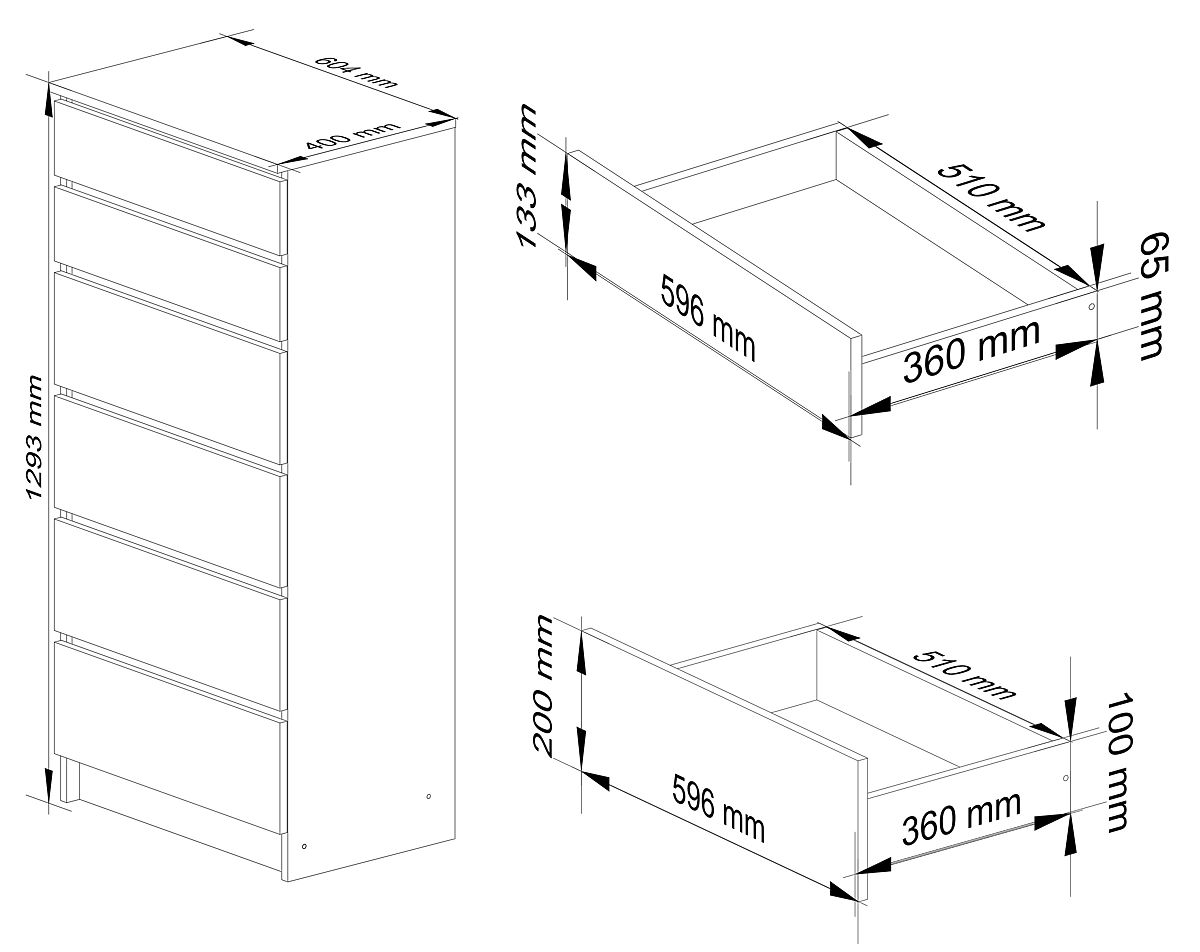 Stilvolle, geräumige und helle Wohnzimmer benötigen ebenfalls passende Möbel und Accessoires. Für Kunden, die eine farblich und qualitativ abgestimmte Kommode für ihre Innenräume suchen, haben wir ein großartiges Produkt vorbereitet, das vollständig aus laminierten Platten gefertigt ist. Die weiße Kommode präsentiert sich hervorragend und passt sich dem Design der anderen Möbel an. Sie verfügt über 6 praktische Schubladen mit einer Tiefe von bis zu 40 Zentimetern, in denen alle notwendigen Accessoires untergebracht werden können. Die Kommode hat eine Höhe von 130 Zentimetern, was es ermöglicht, weitere Accessoires oder TV-Geräte auf ihrer Oberfläche zu platzieren. Die robusten Wände bestehen aus einer dicken 1,6 mm Platte, die die entsprechenden Festigkeitsparameter gewährleistet. Die Kanten der Kommode wurden zusätzlich mit einer Beschichtung geschützt, die das Möbelstück vor Abnutzung oder anderen mechanischen Beschädigungen schützt. Die großartige Farbgebung und das einfache, praktische Aussehen der Möbel ermöglichen sicherlich eine Abstimmung mit anderen Produkten in Ihrer Wohnung. Darüber hinaus enthält die Kommode Schränke mit eingebauten Kugellaufschienen, die das Herausziehen und Schließen der einzelnen Fächer erheblich erleichtern. Das verkaufte Produkt wird in einer Version zur Selbstmontage geliefert, und wir fügen auch die notwendigen Anweisungen bei, wie dieser Prozess durchzuführen ist.