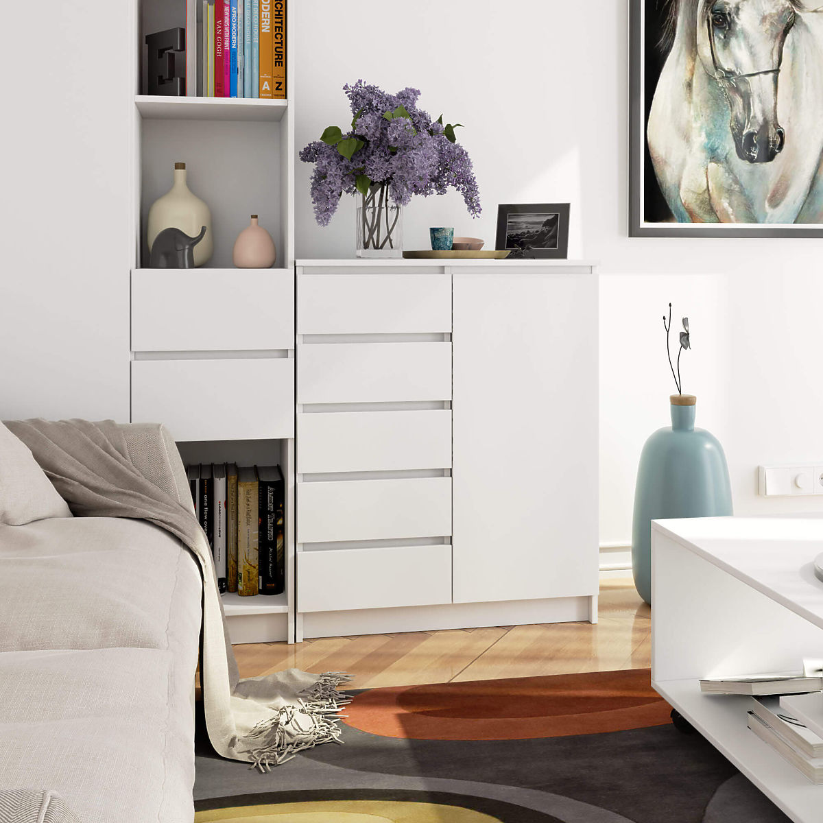 Die Kommode K80 cm 1T 5S kann frei mit anderen Möbeln kombiniert werden, wie kleinere und größere Schränke, Schreibtische oder Regale, die ebenfalls im Angebot enthalten sind. Es handelt sich um hochwertige, praktische Möbel zu günstigen Preisen. Damit lässt sich ein heller, ansprechender Raum schaffen, der mit einfachen, aber eleganten Möbeln ausgestattet ist, die perfekt in jedes modern eingerichtete Interieur passen.