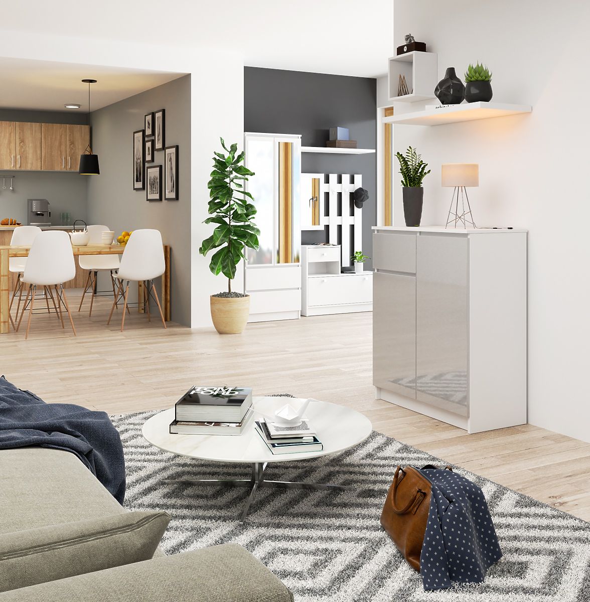 Die Kommode K 80 weiß-metallic ist ein modernes, sogar minimalistisches Möbelstück, das gleichzeitig universell in der Funktionalität ist. Sie bietet viele Nutzungsmöglichkeiten – sie eignet sich sowohl als Wäscheschrank im Kinderzimmer als auch als Aufbewahrungsmöbel für Kleinigkeiten im Wohnzimmer oder Schlafzimmer und sogar als praktische Schrank für Schlüssel, Mützen oder Handtaschen im Flur. Sie kann auch perfekt in ein minimalistisches Esszimmer passen.