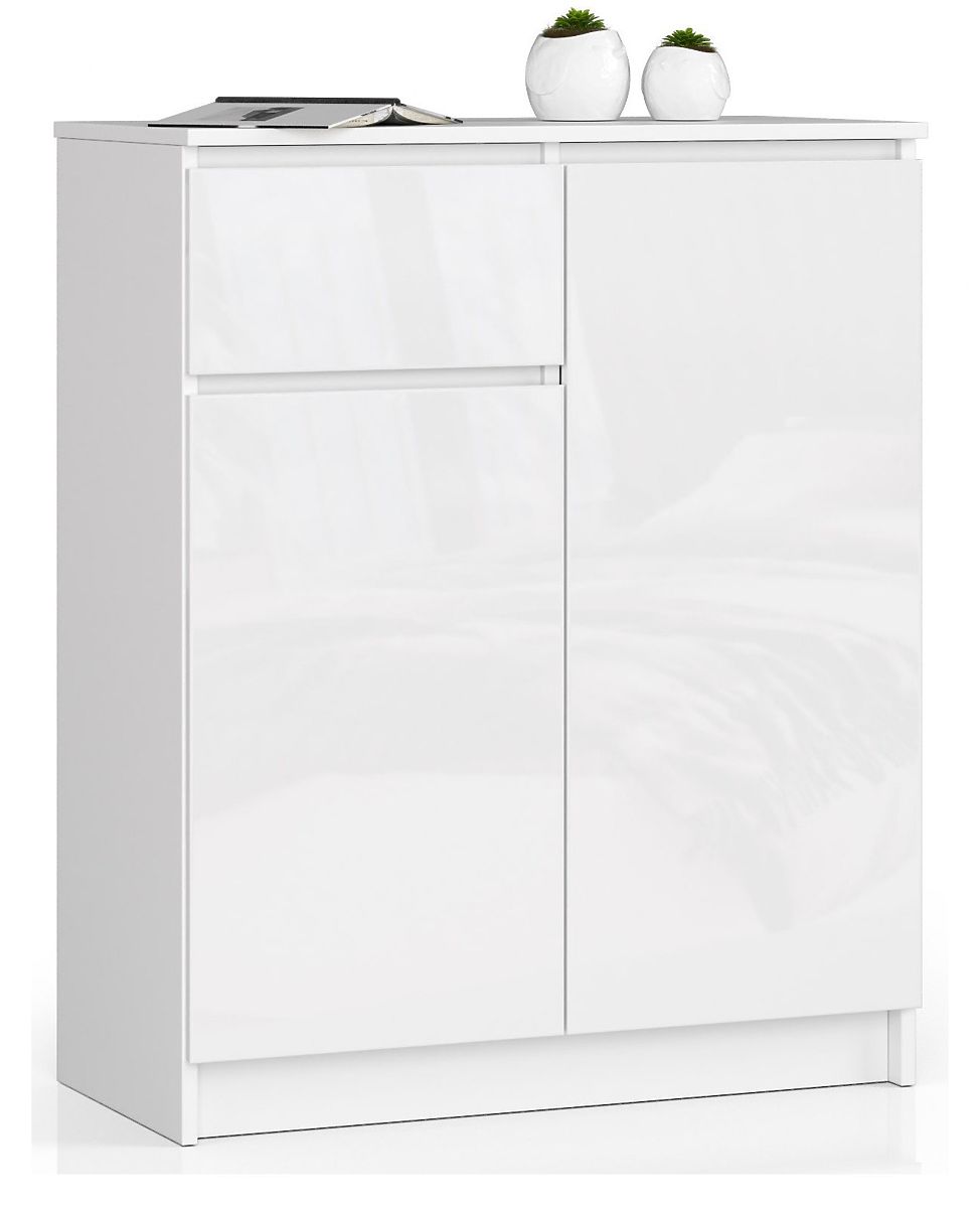 Die kleine weiße Kommode ist mit einer praktischen Schublade und zwei geschlossenen Schränken ausgestattet - in jedem befinden sich zwei Regale. Das Möbelstück zeichnet sich durch eine solide Konstruktion und sorgfältige Verarbeitung aus. Das präsentierte Angebot erfreut das Auge und erfüllt die Erwartungen auch der anspruchsvollsten Kunden in Bezug auf Funktionalität. Die Kommode K 80 cm ist eine Kombination aus einem weißen Korpus mit hochglänzenden Frontflächen in derselben Farbe. Geschmackvolle Möbel, die sich zweifellos in vielen Innenräumen im skandinavischen, minimalistischen oder modernen Stil hervorragend machen werden.