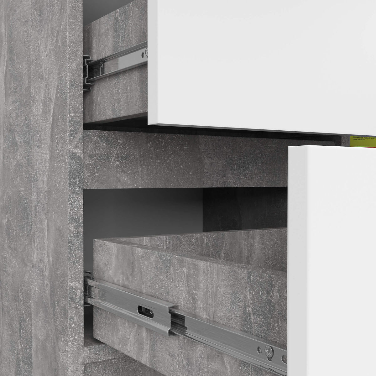 Die kleine Kommode ist ein Einrichtungselement, das in jedem Raum Verwendung findet. Moderne Farben, robuste Konstruktion und sorgfältige Verarbeitung führten zur Schaffung eines Schranks, der sich beispielsweise im Flur, Wohnzimmer oder Jugendzimmer, aber auch im Schlafzimmer bewährt. Sie kann auch in Büroräumen genutzt werden, um zahlreiche Dokumente und andere Bürobedarf zu verstauen. Die Kommode besteht aus einer Tür (innen befinden sich zwei Regale) und 3 Schubladen. Das Möbelstück kombiniert Beton- und Weißtöne.