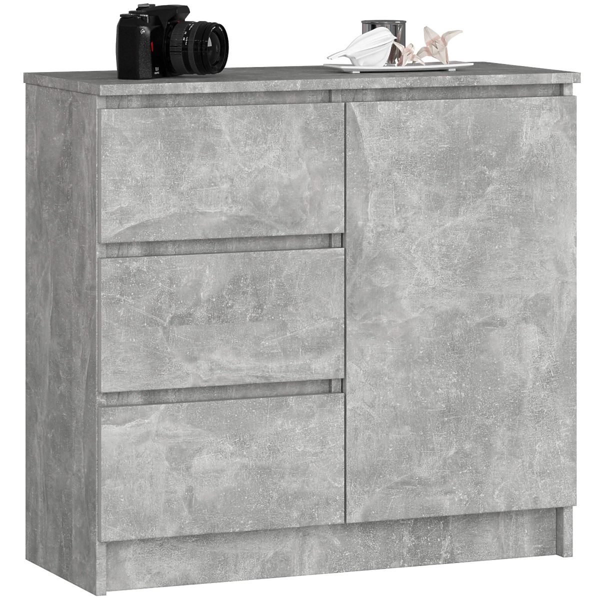 Die kleine Kommode ist ein Einrichtungselement, das in jedem Raum Verwendung findet. Moderne Farben, solide Konstruktion und sorgfältige Verarbeitung führten zur Entstehung eines Schranks, der sich beispielsweise im Flur, Wohnzimmer oder Studentenwohnheim, aber auch im Schlafzimmer bewährt. Sie kann auch in Büroräumen genutzt werden, wo sie die Aufbewahrung vieler Dokumente und anderer Bürobedarf ermöglicht. Die Kommode besteht aus einer Tür (innen mit zwei Regalen) und 3 Schubladen. Das Möbelstück kombiniert eine Betonfarbgebung.