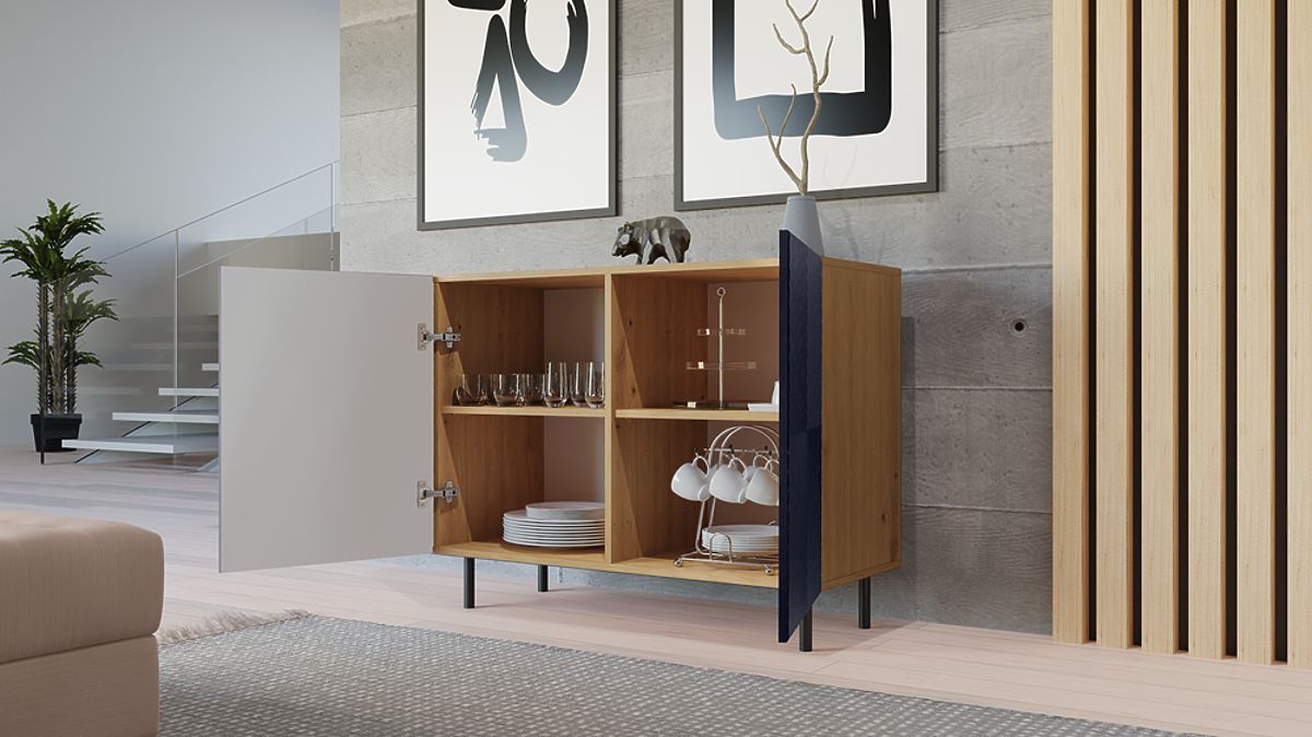 • TIP-ON-System der Kommodentüren - sie öffnen sich durch leichtes Drücken der Front mit mechanischer Öffnungsunterstützung.