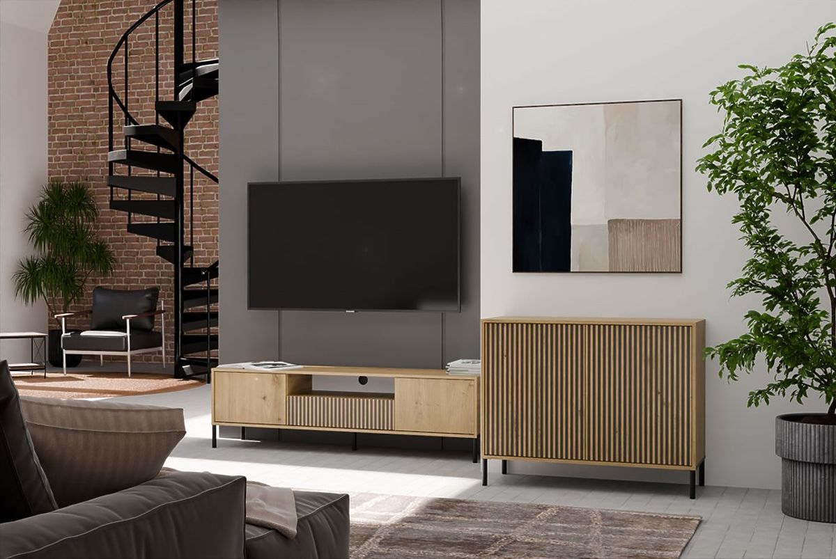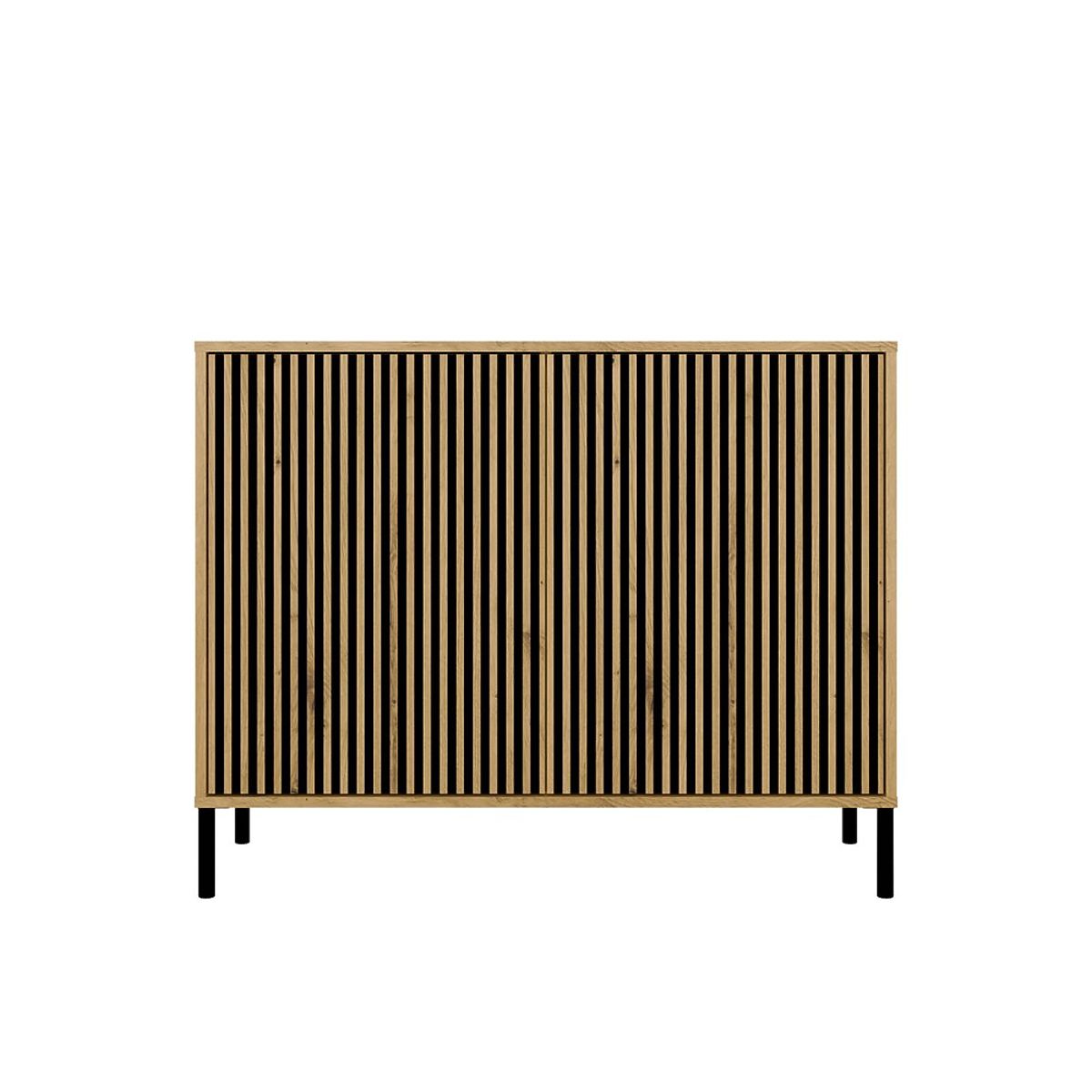 FARBE: EICHE ARTISANELEGANZ UND PRAXIS IN EINEMDie Kommode KAMARO 2D SLIM ist eine Kombination aus Ästhetik und Funktionalität, die sich perfekt für das Wohnzimmer, Gästezimmer, Schlafzimmer oder Arbeitszimmer eignet. Dank der gerillten Frontplatte der Türen (die an Lamellen erinnert) erhält das Möbelstück ein modernes und originelles Aussehen, das perfekt in zeitgenössische Innenräume passt.