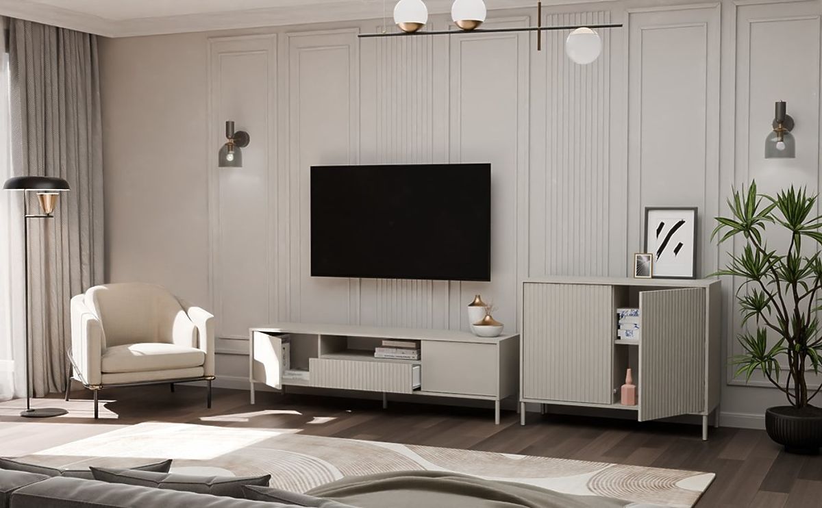 Die Kommode KAMARO 2D SLIM KASCHMIR passt perfekt zu anderen Möbeln der KAMARO-Kollektion, wie TV-Schränken, Vitrinen oder anderen Kommoden. Erstellen Sie harmonische Sets, die auf Ihre Bedürfnisse und Ihren Lebensstil abgestimmt sind!