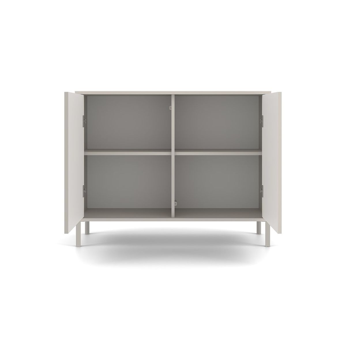 Das moderne TIP-ON-System ermöglicht eine bequeme Nutzung ohne Griffe — einfach die Türen leicht drücken, um die Schranktür zu öffnen. Die Kommode bietet viel Stauraum und behält dabei einen minimalistischen und eleganten Charakter, der zu vielen Arrangements passt.