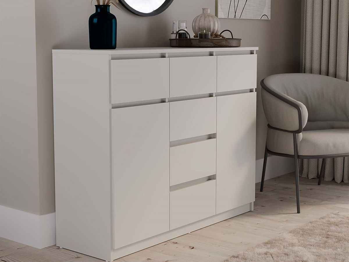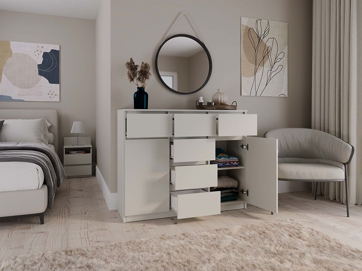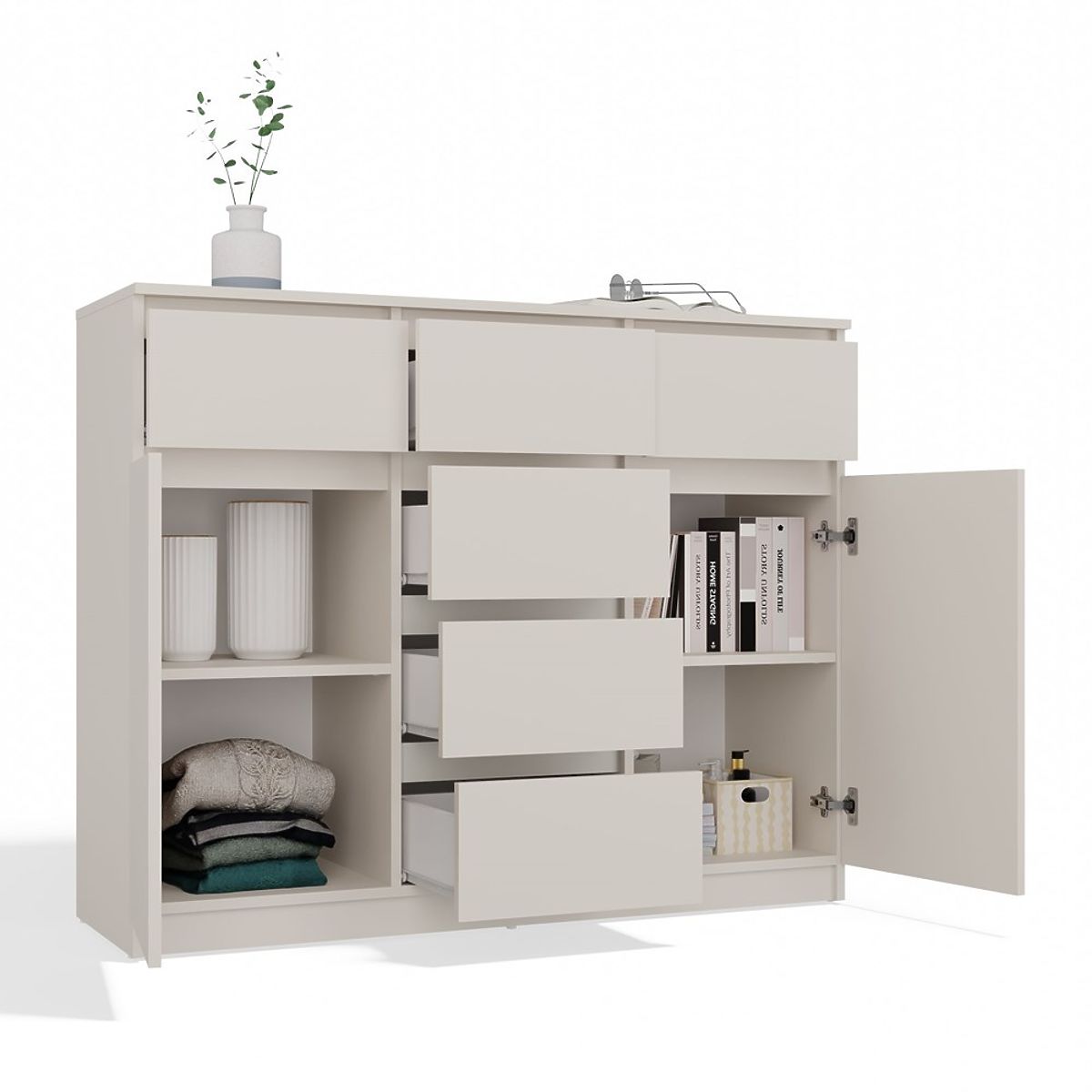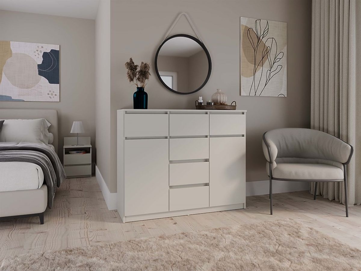 Geräumigkeit und Funktionalität: Die Kommode ist mit 2 Türen und 6 geräumigen Schubladen ausgestattet, die bei der Organisation Ihres Raumes helfen. Ideal für Schlafzimmer, Wohnzimmer, Kinderzimmer oder Flur – überall dort, wo zusätzlicher Stauraum benötigt wird.