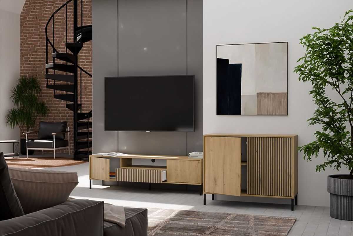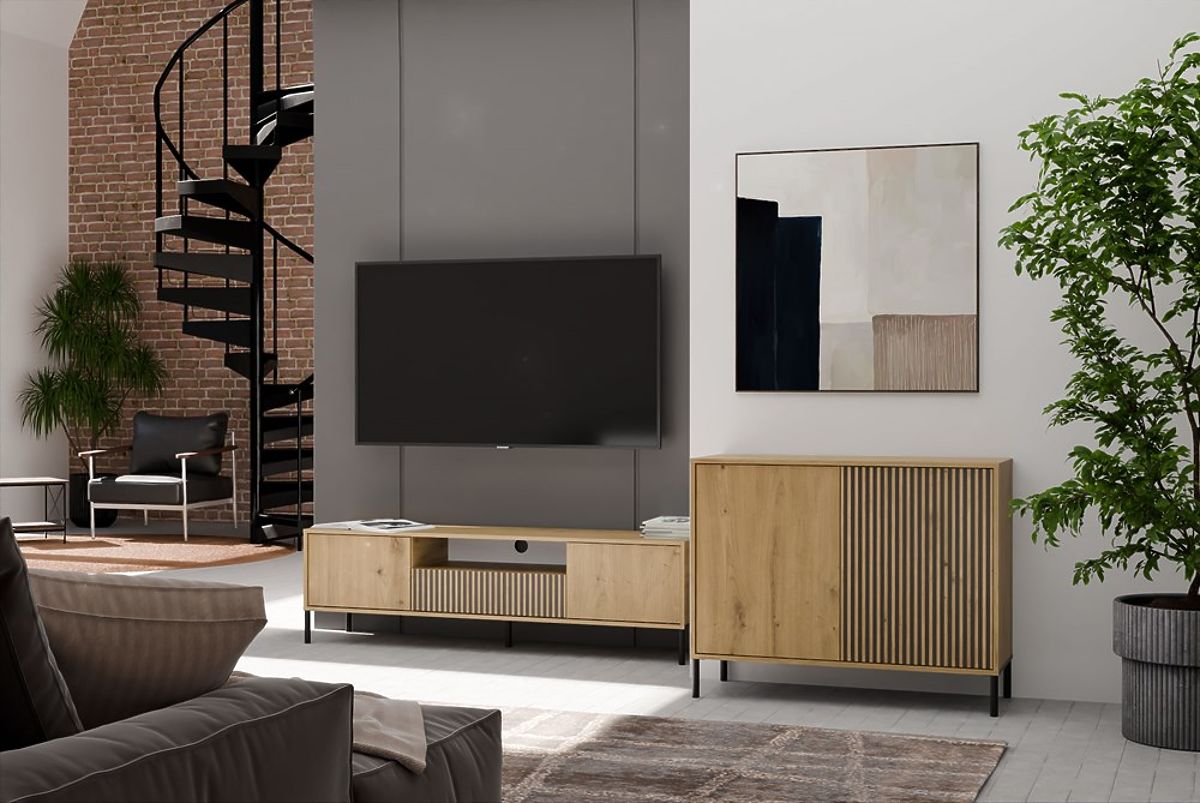 Die Kommode KAMARO 2D SLIM/GLATT EICHE ARTISAN ist eine Kombination aus Ästhetik und Funktionalität, die sich hervorragend für das Wohnzimmer, Gästezimmer, Schlafzimmer oder Büro eignet. Dank der geriffelten Front einer Tür (ähnlich wie Lamellen) erhält das Möbelstück ein modernes und originelles Aussehen, das perfekt zu modernen Interieurs passt.