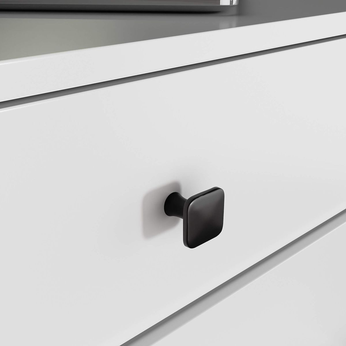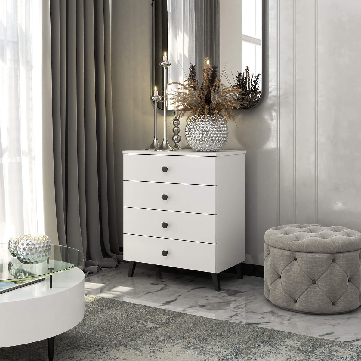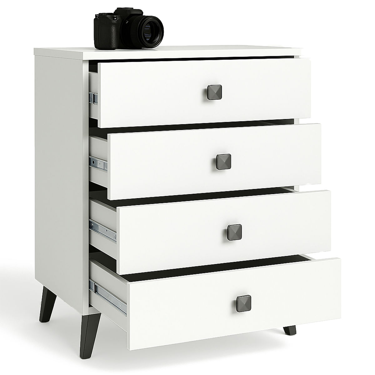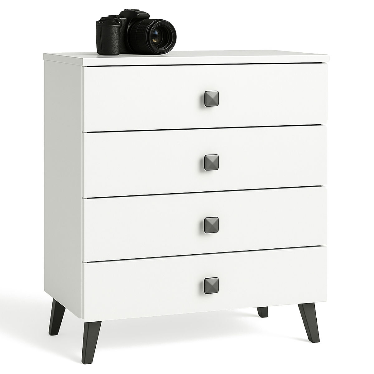 Die kleine Kommode ist ein Einrichtungselement, das in jedem Raum Verwendung findet. Moderne Farben, robuste Konstruktion und sorgfältige Verarbeitung führten zur Schaffung eines Schranks, der sich beispielsweise für den Flur, das Wohn- oder Kinderzimmer, aber auch für das Schlafzimmer eignet. Sie kann auch in Büroräumen genutzt werden, um zahlreiche Dokumente und andere Büroartikel zu verstauen. Die Kommode besteht aus 4 Schubladen. Das Möbelstück kombiniert weiße und schwarze Farben.