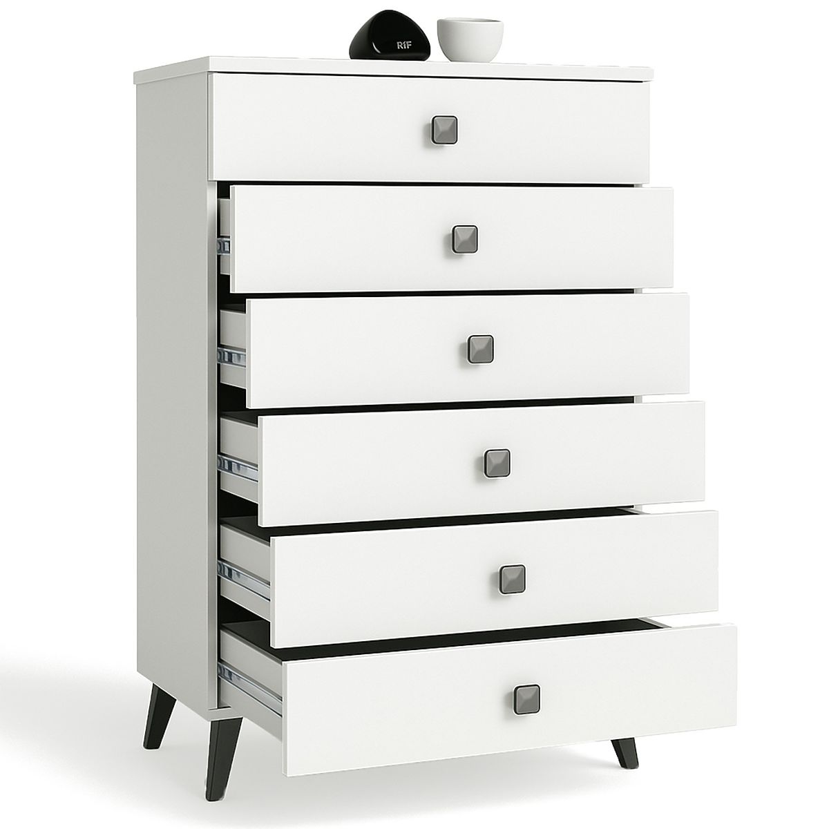 Die kleine Kommode ist ein Einrichtungselement, das in jedem Raum seinen Platz findet. Moderne Farben, robuste Konstruktion und sorgfältige Verarbeitung führten zur Entstehung eines Schranks, der sich beispielsweise im Flur, Wohn- oder Kinderzimmer, aber auch im Schlafzimmer bewährt. Sie kann auch im Bürobereich genutzt werden, wo sie die Aufbewahrung vieler Dokumente und anderer Büromaterialien ermöglicht. Die Kommode besteht aus 6 Schubladen. Das Möbelstück kombiniert die Farben Weiß und Schwarz.
