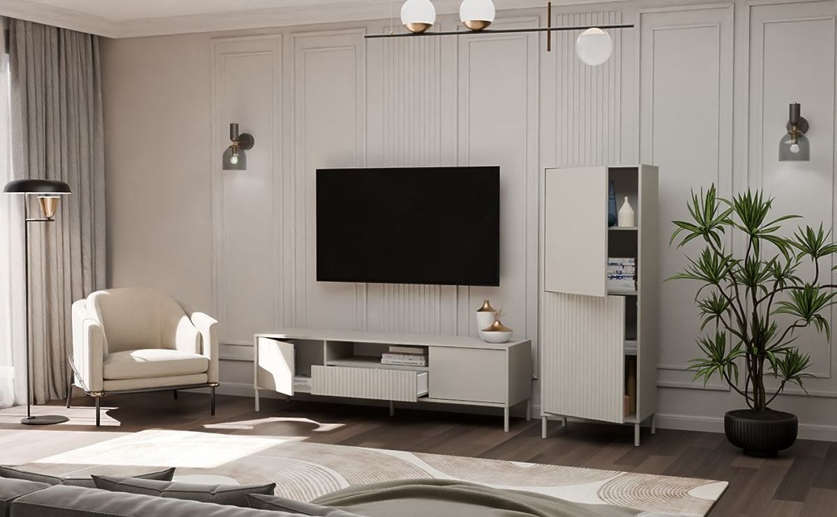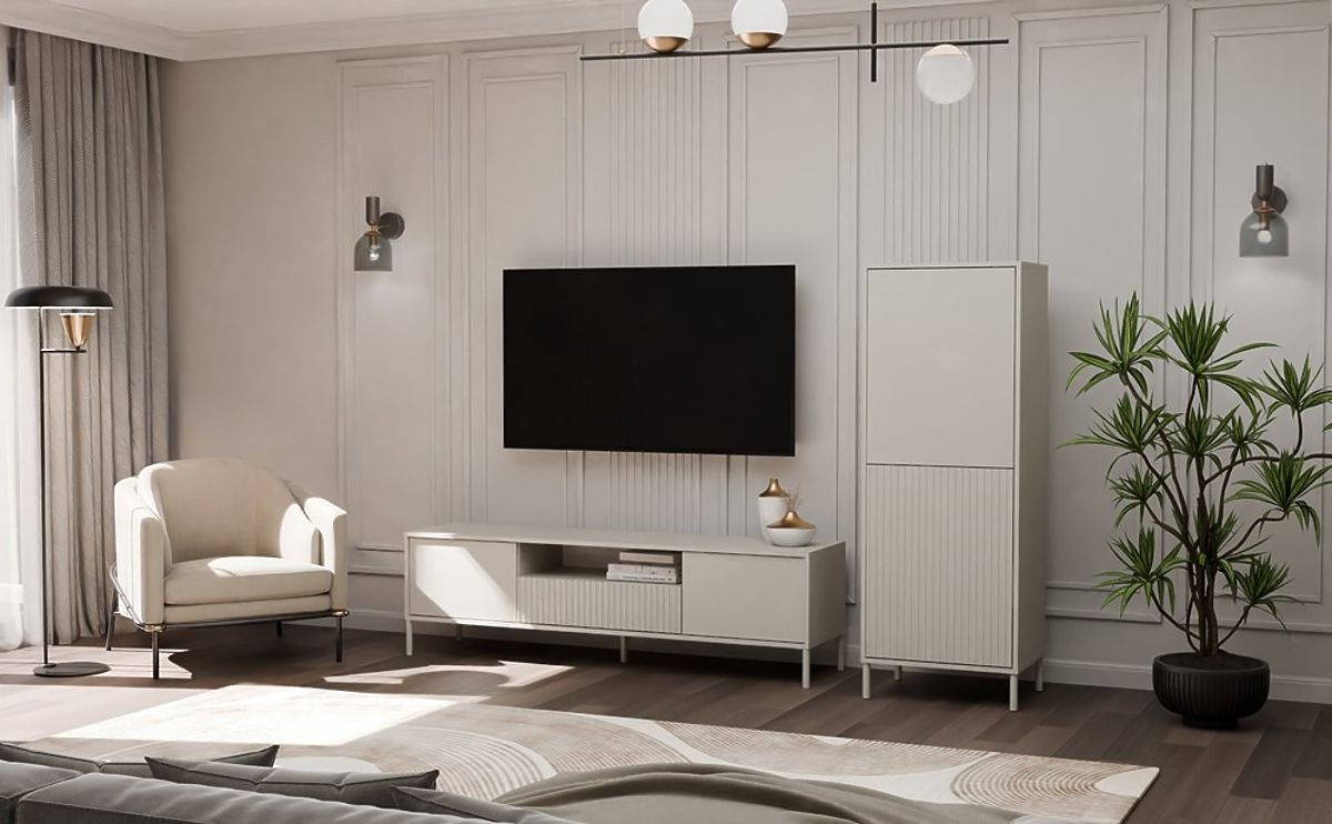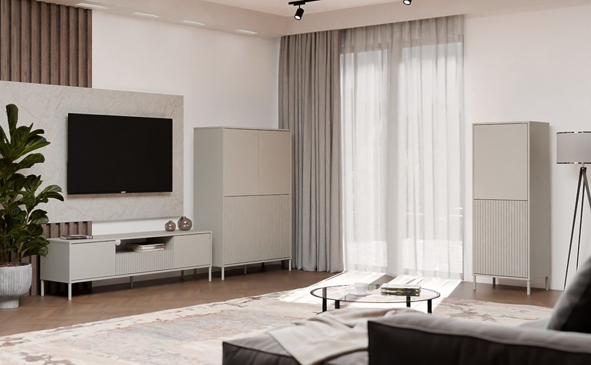 Banaby.de » Kindermöbel / Kinderkommoden und Schränke / Kinderkommoden / Vitrine KAMARO 2DK SLIM/GLATT KASCHMIR Lamellenstruktur + Klassisches Frontpanel