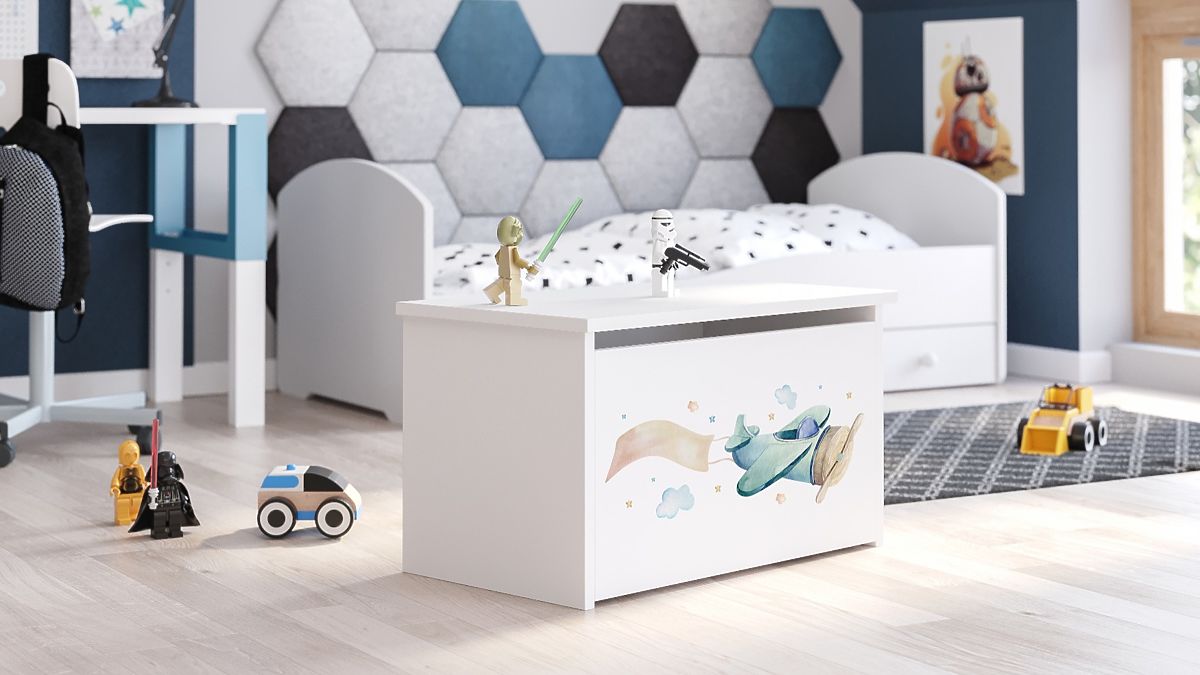 Banaby.de » Kindermöbel / Kinderkommoden und Schränke / Spielzeugtruhen / Spielzeugtruhe Daria weiß mit Flugzeugdruck