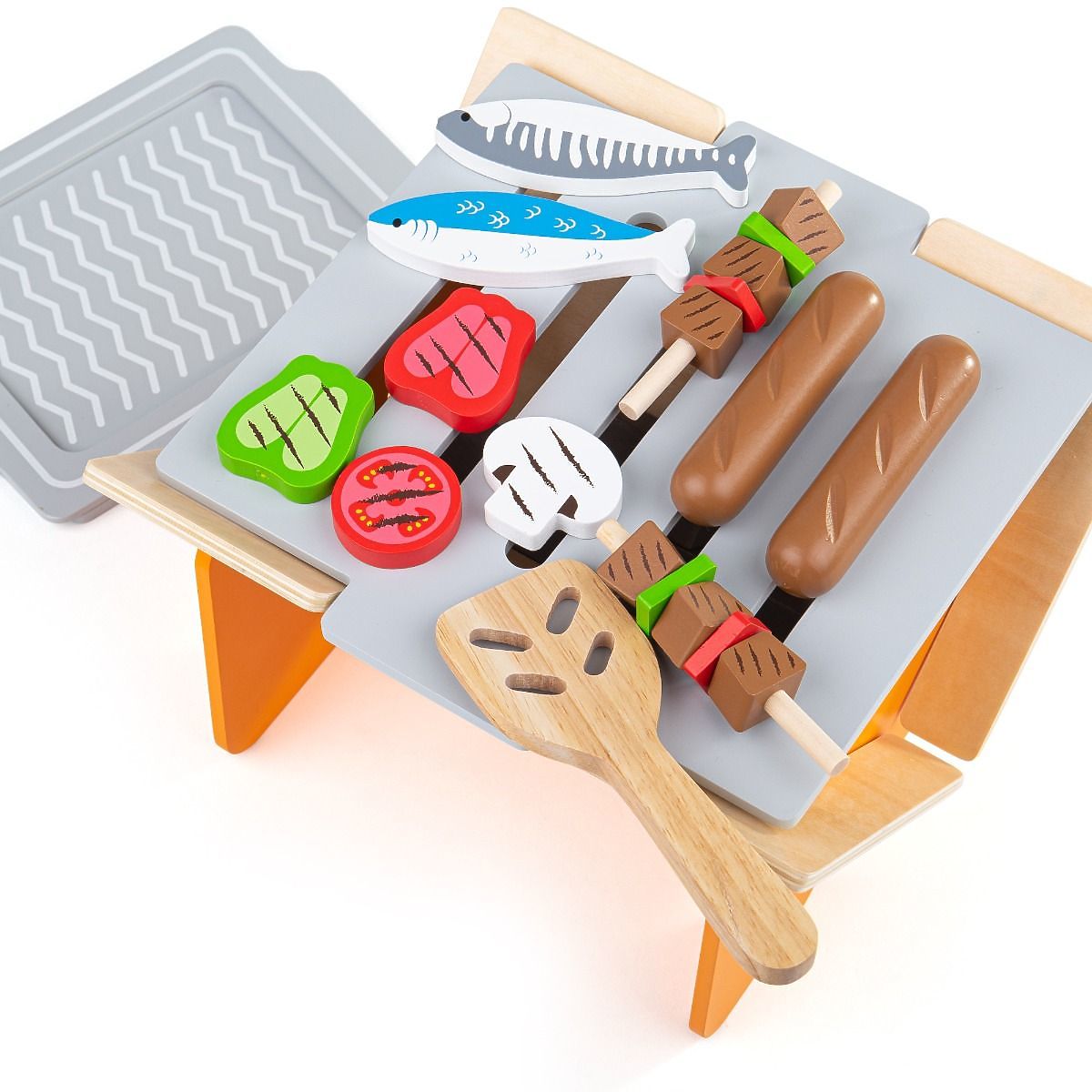 Gartenparty bei Ihnen zu Hause! Was grillen Sie zuerst? Der hölzerne Tischgrill enthält 10 Lebensmittelstücke, einen Wender, ein Tablett und Kohlen. Alle Teile lassen sich einfach ineinander stecken, sodass keine Schrauben für die Montage benötigt werden. Hergestellt aus hochwertigen Materialien aus verantwortungsvollen Quellen. Entspricht den europäischen Sicherheitsstandards. Hauptmerkmale: 5-teiliges Grillset, Tablett, Wender und 10 Lebensmittelstücke robust und langlebig gefertigt unter Berücksichtigung der Nachhaltigkeit
