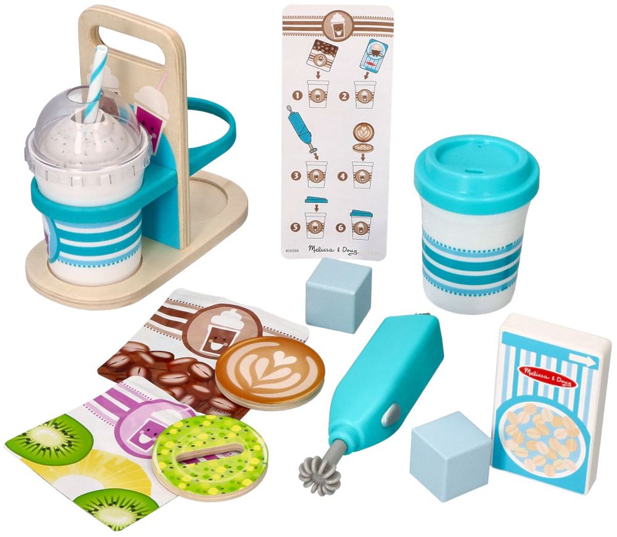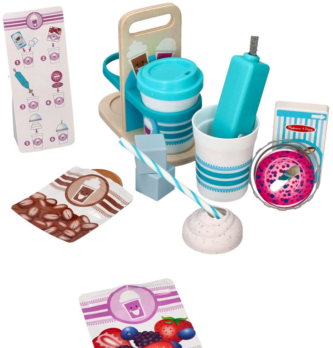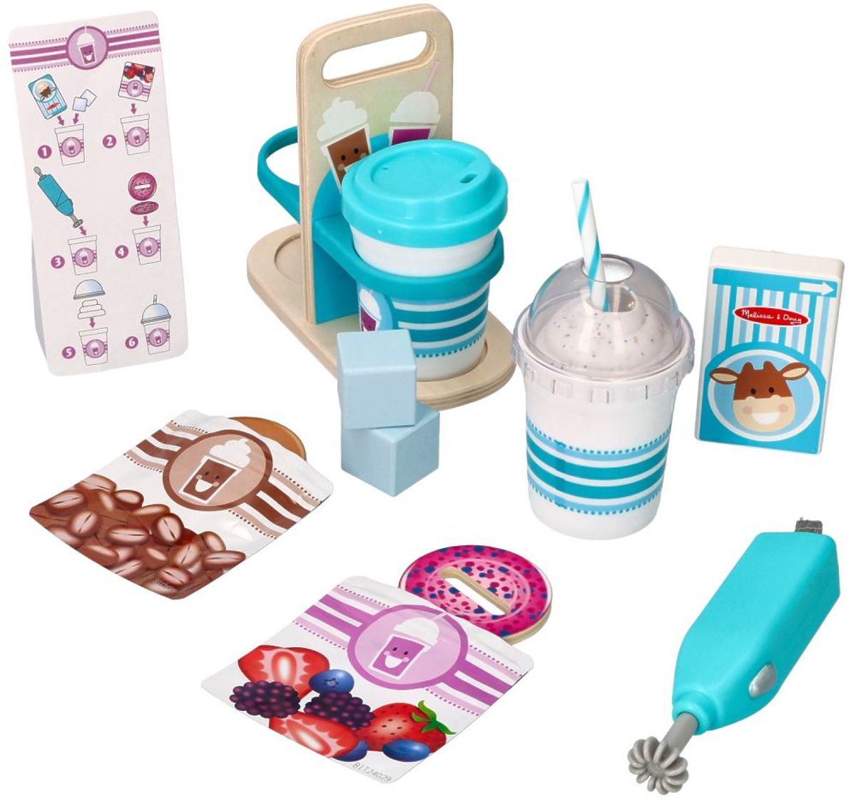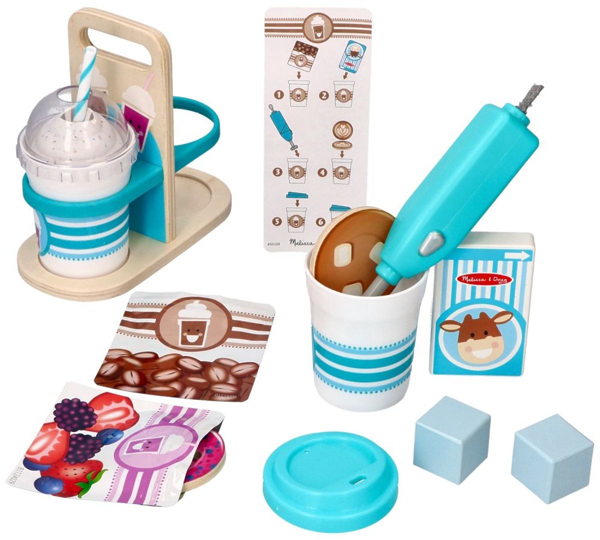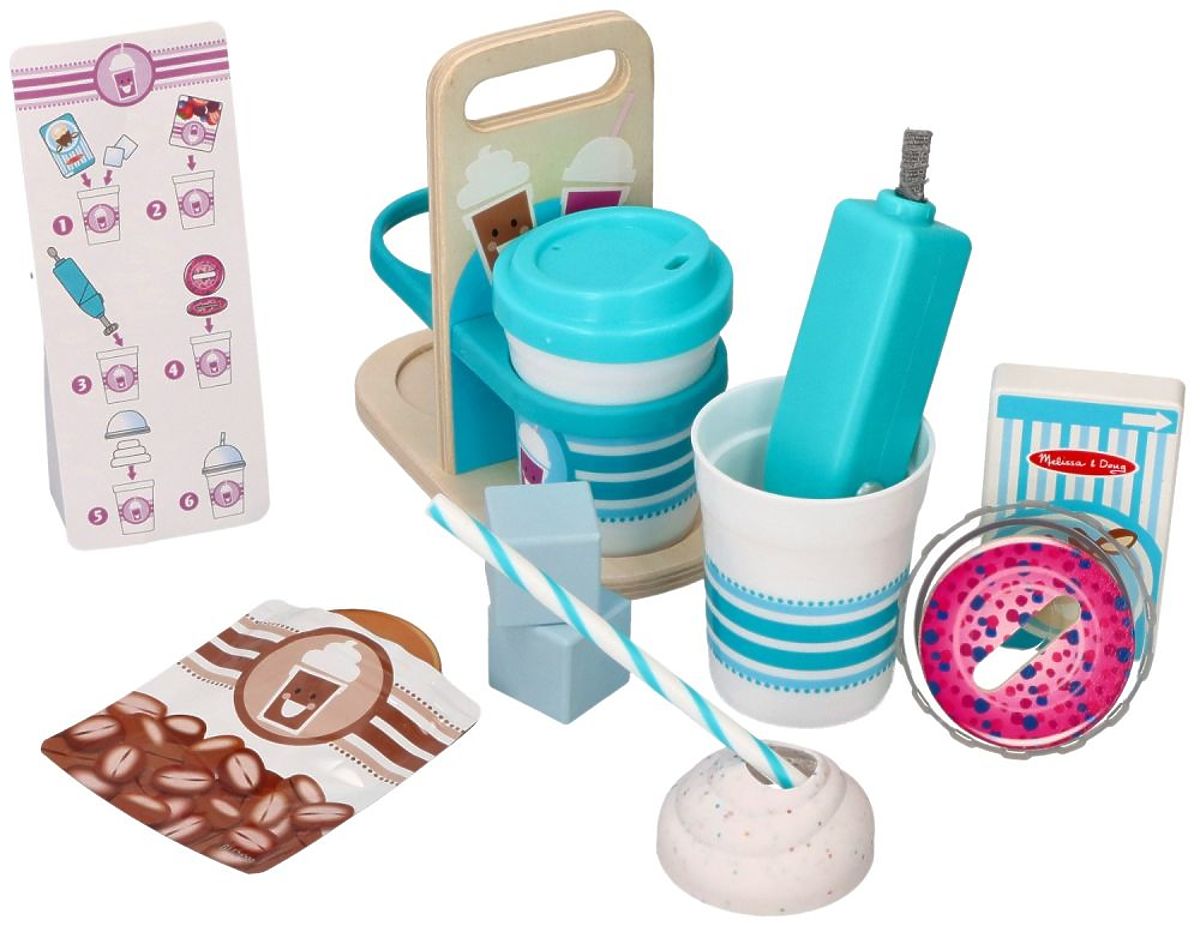 Bereiten Sie ein köstliches Smoothie (Blaubeere oder Gemüse) zu, mischen Sie das Getränk mit dem vibrierenden Milchaufschäumer, fügen Sie die hölzernen Eiswürfel hinzu und setzen Sie schließlich den Deckel auf und fügen Sie den Strohhalm hinzu. Wärmen Sie sich mit einem heißen Kakao oder Kaffee mit dem Deckel für heiße Getränke unterwegs auf. Die Getränke können in einer Holzverpackung transportiert werden, was das Rollenspiel so realistisch macht.