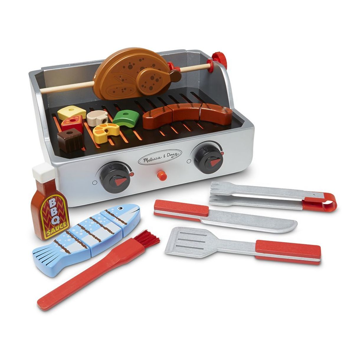 Der Grill eignet sich für Spaß zu Hause und im Garten. Das Spielzeug besteht aus Holz mit Kunststoffelementen wie Schaltern und einem Brenner. Das Produkt ist auf eine moderne Silberfarbe abgestimmt, die Stahl perfekt imitiert.