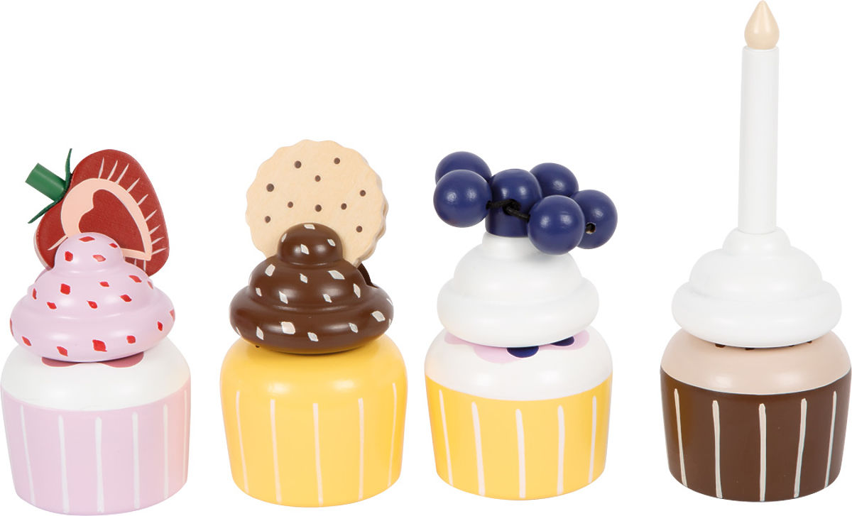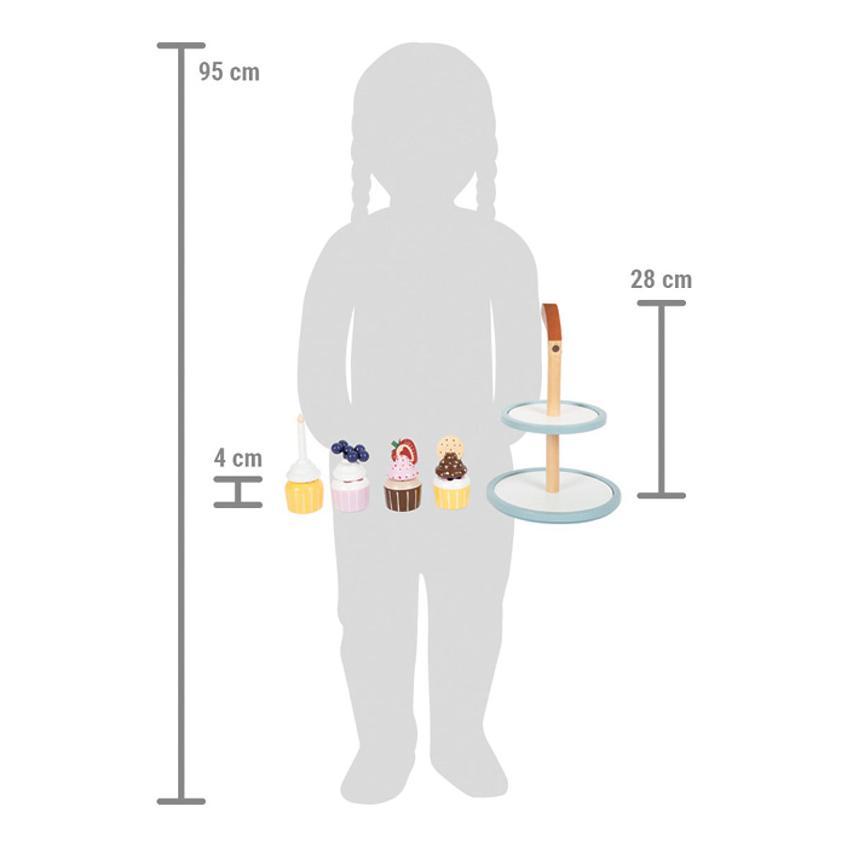 Leckereien für die Kinderküche. Dieser Ständer mit vier Förmchen lädt kleine Konditoren zum aktiven Spielen und Präsentieren köstlicher Muffins ein. Der Ständer hat zwei Etagen, die dazu dienen, Süßigkeiten in Schichten auszustellen. Das System aus kombinierbaren Sockeln und cremigen Toppings ermöglicht vielfältige Kombinationsmöglichkeiten. Die einzelnen Teile werden durch integrierte Magnete zusammengehalten. Das Set wird durch ein Doppelkeks, einen Erdbeerschnitt, Blaubeeren und eine Geburtstagskerze ergänzt, mit der die Torten dekoriert werden können. Das weckt die Lust auf eine Teeparty mit Puppen, Teddybären usw. Wer bekommt da nicht Appetit? Ein ideales Zubehör für die Küche und den Lebensmittelladen. Details wie der Griff aus dunkelbraunem Kunstleder, integrierte Magnete und moderne, dezente skandinavische Farben machen den Ständer zu einem hochwertigen und stilvollen Hingucker im Kinderzimmer. Hauptmerkmale: dezente skandinavische Farben inspirieren und regen zur Konversation an 1 Ständer, 4 Muffins, 4 Toppings, 1 Kerze, 1 Keks, 1 Erdbeere, 1 Blaubeere