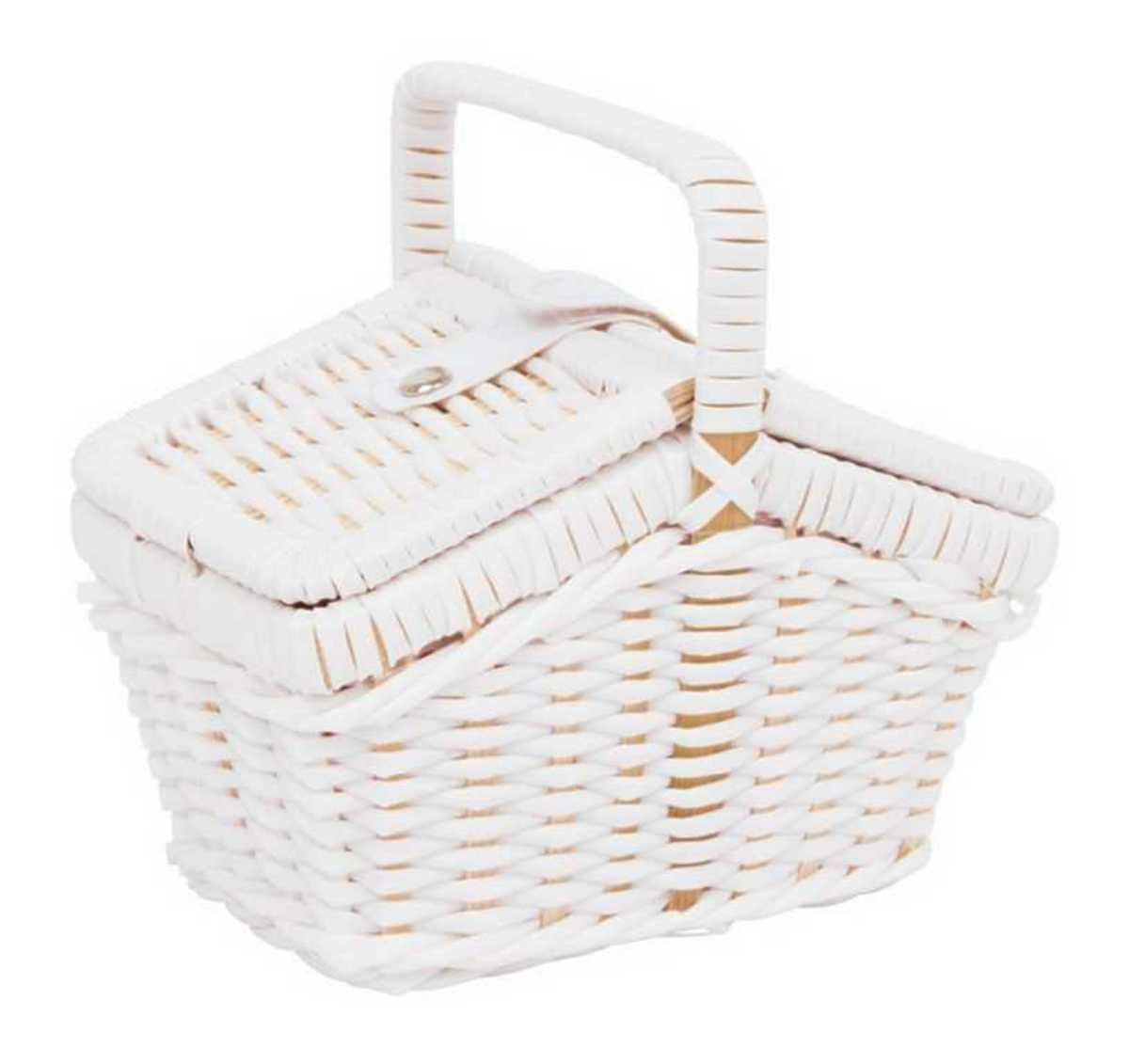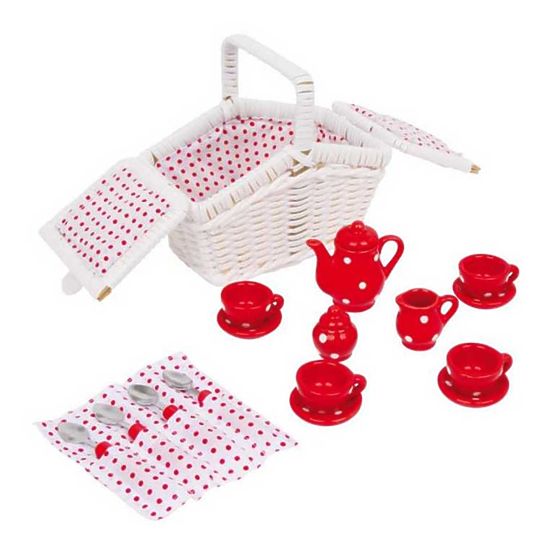Niedliches Mini-Picknick-Set in einem zusammenklappbaren Korb. Im Inneren befinden sich eine Teekanne, Tassen, Teller, Milch- und Zuckerdosen aus Keramik sowie vier kleine Löffel mit glasierten Keramikgriffen in einer hübschen Stoffserviette. Kontrastierende Punktverzierung. Hauptmerkmale: Keramikgeschirr passt perfekt in einen Weidenkorb, enthält 17 Teile
