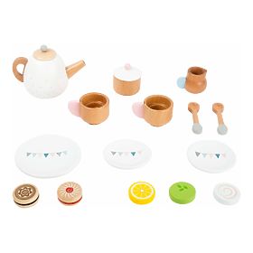 Es wird Sie mit der sorgfältigen Verarbeitung des Massivholzes überraschen, die Komponenten sind robust und speziell an Kinderhände angepasst. Das natürliche Material wird gekonnt aufgegriffen und spielerisch mit sanften Pastelltönen kombiniert. Das Design betont Details, die Deckel der Teekanne und der Zuckerdose sind daher abnehmbar und das Spiel kann noch glaubwürdiger werden. Mit dem Set können Sie eine Kinderküche, einen Stand oder Dessert-Attrappen passend ergänzen.