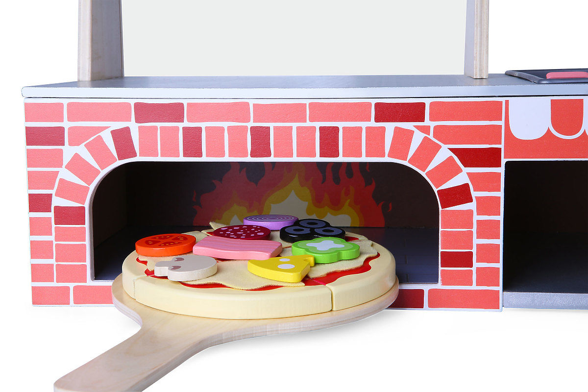 Dank des reichhaltigen Zubehörs dieses Pizzeria-Sets können zwei Kinder am Spiel teilnehmen, eines spielt den Koch und das andere wird zum Kunden.