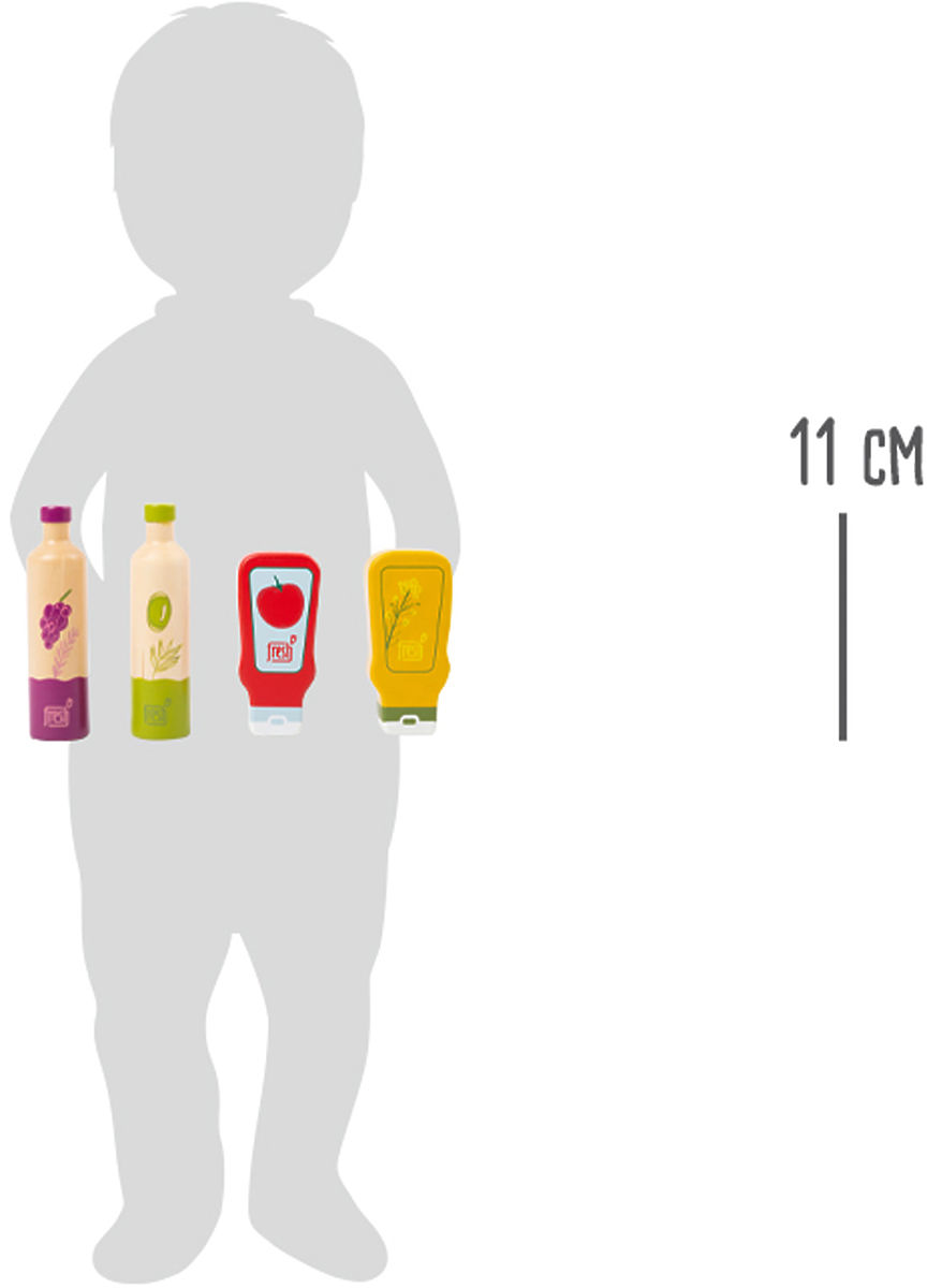 Das richtige Gewürz für die Kinderküche! Das Spielset enthält Fläschchen aus hochwertigem Holz in den typischen Farben des jeweiligen Produkts. Dank der auffälligen Illustrationen auf den Flaschen kann das Kind ihren Inhalt leicht erkennen. Das Set enthält Essig, Öl, Ketchup und Senf. Hauptmerkmale: Das Set enthält 4 Stücke, fördert die Vorstellungskraft und das Rollenspiel.