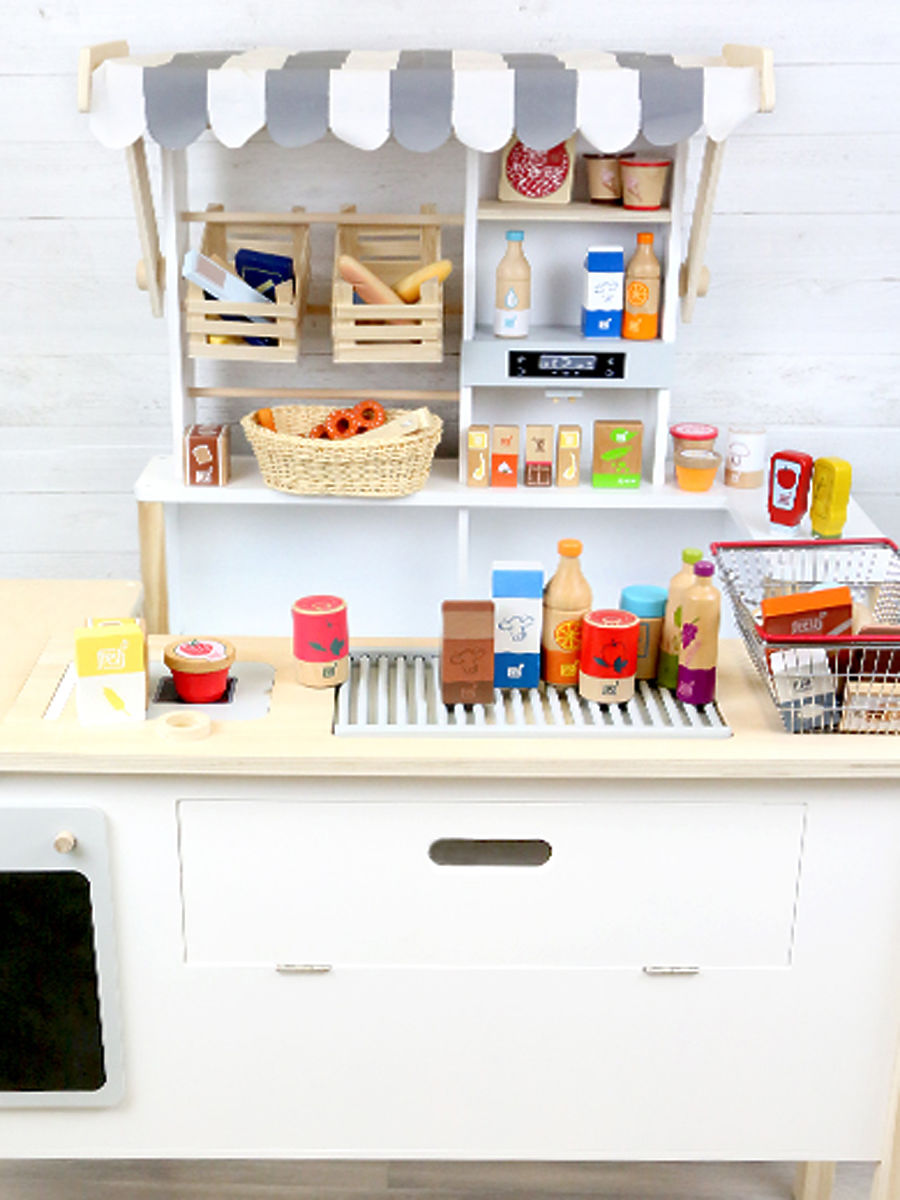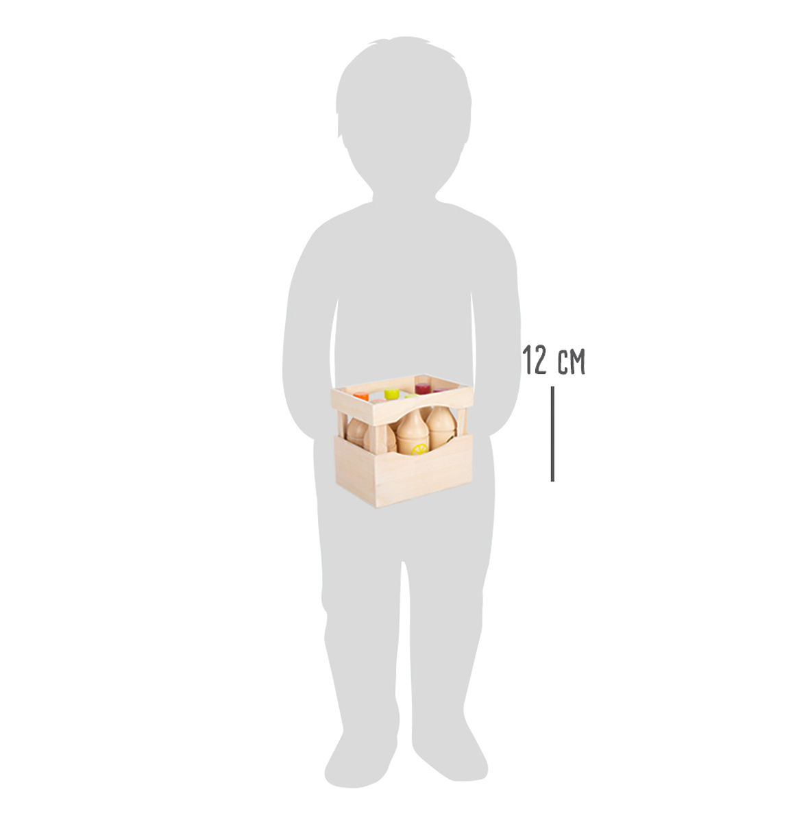 Vom Regal in den Einkaufswagen! Diese Holzkiste enthält 6 hölzerne Getränkeflaschen. Es gibt 2 Flaschen Orangen-, Zitronen- und Kirschlimonade. Sie sind ideal für die Kinderküche oder den Verkaufsstand. Dank der einfachen Illustrationen verstehen auch die kleinsten Kinder das Spielzeug. Das robuste Holz garantiert langanhaltenden Spielspaß. Hauptmerkmale: enthält 6 Getränkeflaschen, Verarbeitung aus massivem Holz garantiert langanhaltenden Spielspaß, Zubehör für die Kinderküche oder den Verkaufsstand