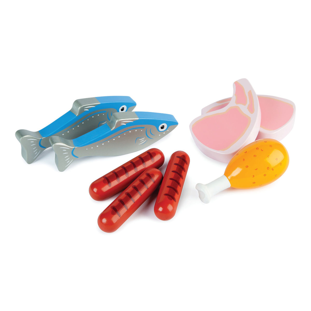 Frische Lieferung von Fleisch und Fisch in einer Holzkiste mit Griffen. Ein tolles Spielzeug zum Spielen von Händlern oder Köchen. Das Set enthält 2 Fische, 2 Koteletts, 3 Würstchen und 1 Hähnchenschenkel. Eine großartige Möglichkeit, Kindern die Bedeutung einer gesunden und ausgewogenen Ernährung beizubringen, einschließlich der Herkunft der Lebensmittel und deren Zubereitung. Jedes der Stücke ist prall und ideal für kleine Kinderhände. Es fördert kreatives und fantasievolles Spielen. Hergestellt aus hochwertigen Materialien aus verantwortungsvollen Quellen. Entspricht der europäischen Sicherheitsnorm. Hauptmerkmale: Ideale Form für kleine Kinderhände fördert Kreativität und Fantasie
