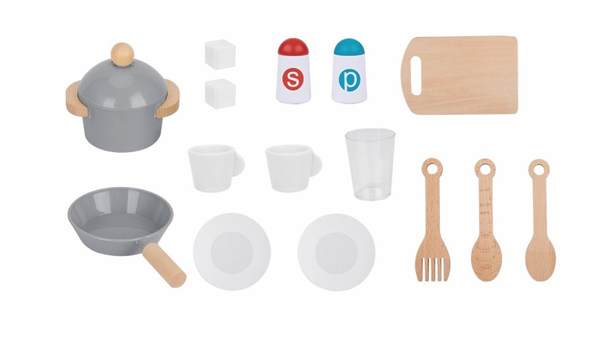 Die große Küche ist das ideale Spielzeug für alle Kinder, die das Kochen lieben. Sie bietet eine großartige Möglichkeit, Kreativität, Selbstständigkeit und kulinarische Fähigkeiten zu entwickeln. Die Küche hat ein modernes Design in einer stilvollen Kombination aus grauer Farbe und goldenen Akzenten mit allen notwendigen Geräten, wichtigem Geschirr und Utensilien. Sie ist ausgestattet mit einem Kochfeld mit rot leuchtenden Herdplatten (kann ein- und ausgeschaltet werden), Backofen und Mikrowelle, Kaffeemaschine, Kühlschrank mit Eiswürfelbereiter mit 2 Eiswürfeln, Geschirrspüler und Spüle. Kleine Köche nutzen zum Zubereiten der Speisen einen Topf mit Deckel, eine Pfanne, ein Schneidebrett, Kochlöffel und einen Pfannenwender. Zum Servieren stehen Teller, Tassen, Gläser sowie Salz- und Pfefferstreuer zur Verfügung. Hauptmerkmale: ausgestattet mit Geräten, Geschirr und Utensilienverschiedene Ablageflächenöffnende Türen Herdplatten des Kochfelds können beleuchtet werdenunterstützt Kinder in langanhaltendem fantasievollem Spielentwickelt Rollenspiele und soziale Fähigkeiten2xAA-Batterien nicht im Lieferumfang enthaltenaus FSC®-zertifiziertem Holz hergestellt Die Marke und das FSC®-Zertifikat (Forest Stewardship Council) garantieren, dass das Holz, aus dem das Produkt hergestellt wurde, nicht illegal geschlagen wurde und aus Wäldern stammt, die auf umweltfreundliche oder naturverträgliche Weise bewirtschaftet werden, wobei strenge Umwelt- und Sozialanforderungen eingehalten werden. Das FSC®-Label auf dem Produkt bedeutet, dass Sie durch Ihren Kauf helfen, Wälder zu schützen und eine umweltfreundliche, verantwortungsvolle oder naturverträgliche Bewirtschaftung zu unterstützen, durch die unsere Wälder stabiler, gesünder, eine natürliche Artenzusammensetzung haben und besser den negativen Folgen des Klimawandels widerstehen.
