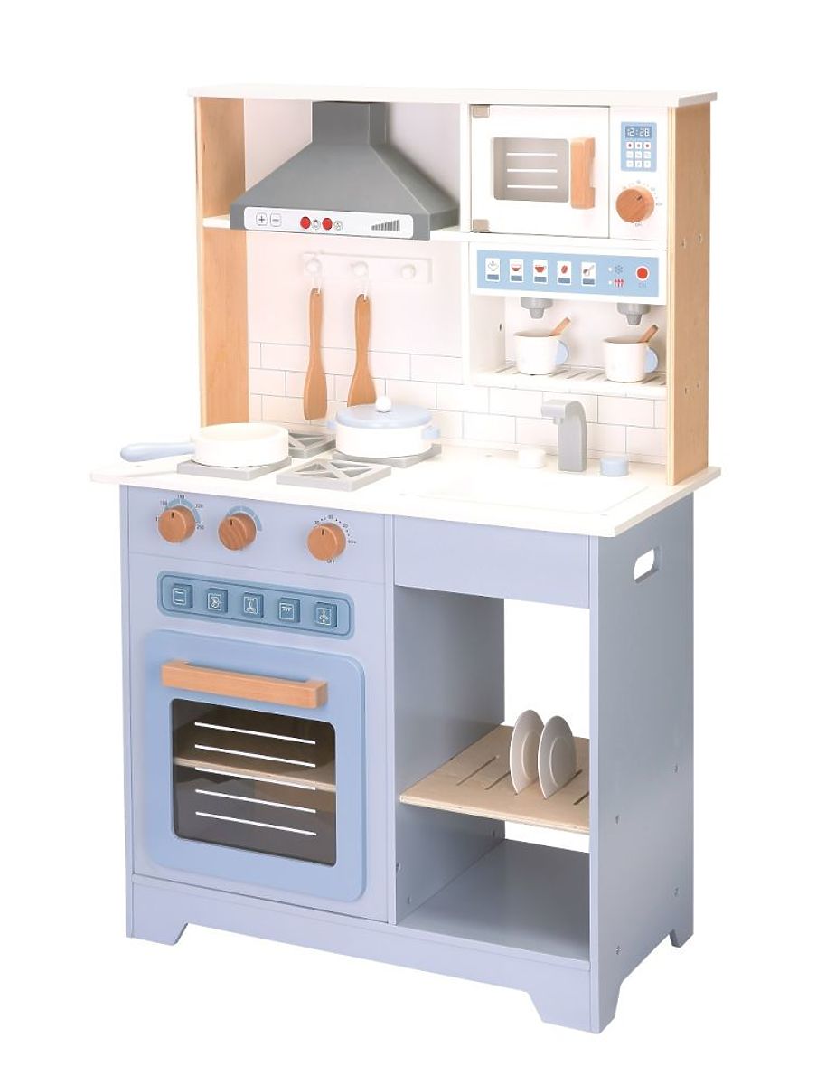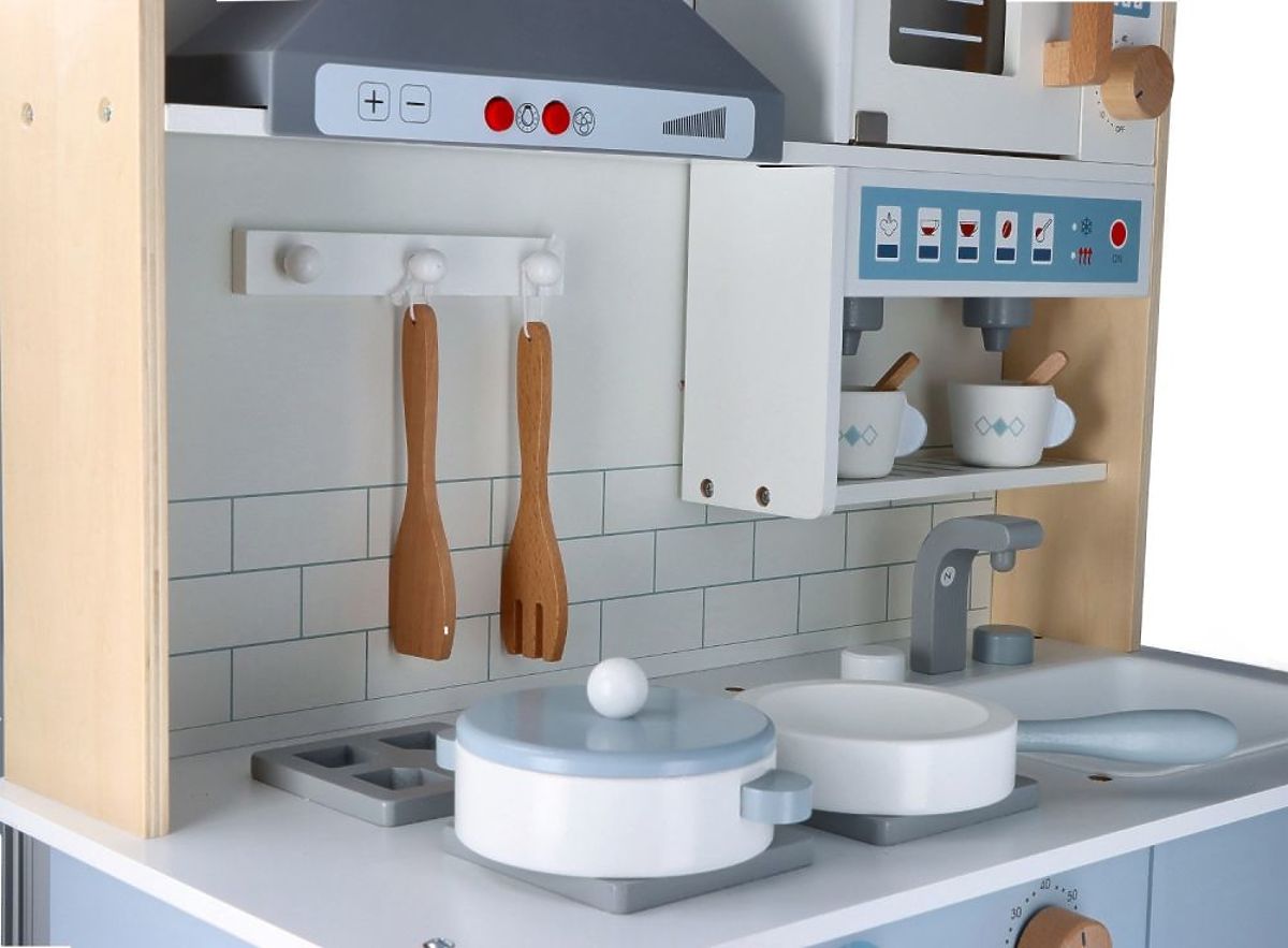 Alle Türen schließen mit Magneten. Die Küche ist bis ins kleinste Detail durchdacht. An den Seiten befinden sich auch zwei Griffe für einfacheren Transport. Die schöne weiß-blau-graue Farbkombination ist ebenfalls modisch und passt in viele Kinderzimmer.