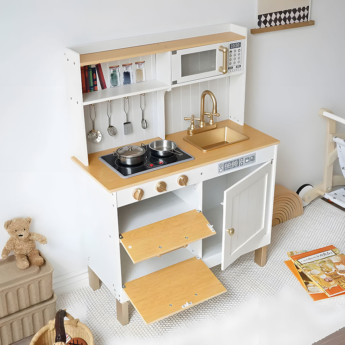 Banaby.de » Spielzeug / Kinderküchen / Holz- küchen / Kinderküche mit Geräuschen und LED, aus Holz, große Schränke zum Öffnen, 7 Zubehörteile ECOTOYS