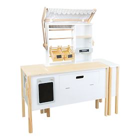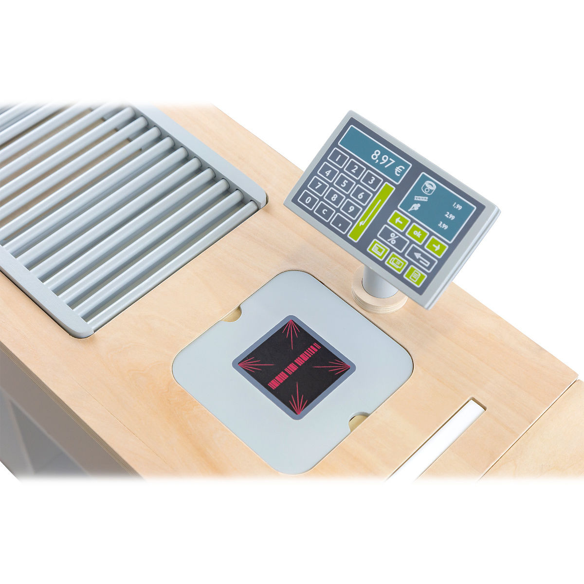 Verkaufsstand, Kiosk oder Buffet? Der große Stand im modernen skandinavischen Design ist modular und multifunktional, bestehend aus vielen Teilen, die Sie in wenigen Augenblicken umbauen und im Hinblick auf den freien Platz zu Hause organisieren können. Die variablen Spielelemente lassen sich vielseitig einsetzen, die Kasse lässt sich in eine Spüle, das Kochfeld in einen Grill und der Backofen in einen Kühlschrank verwandeln. In der Ausstattung finden Sie außerdem eine Waage, Klappregale, Beschriftungstafeln sowie eine Kaffeemaschine und Stauräume mit 2 Kisten. Die Markise der kleinen Theke kann platzsparend heruntergeklappt werden (ihre Bespannung kann farblich abweichen). Der Ständer bietet genug Platz, damit mehrere Kinder gleichzeitig spielen können. Durch das Nachahmen von Alltagssituationen lernen Kinder, wie es ist, Verkäufer zu sein, Kunde zu sein, zu kochen oder mit Menschen umzugehen. Produkt erfordert Montage, Lieferung mit bebilderter Montageanleitung. Hauptmerkmale: multifunktional, vielfältige Nutzung, modularer Aufbau mit variabler Ausstattung fördert die kommunikativen und sozialen Fähigkeiten der Kinder