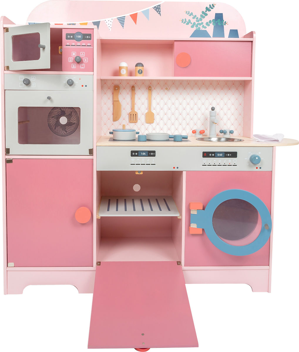 Mit dieser Küche ist der Michelin-Stern Ihr! Diese Kinder-Holzküche im modernen rosa Retro-Design mit Herd, Spüle, Waschmaschine, Geschirrspüler, Kühlschrank, .. mehr