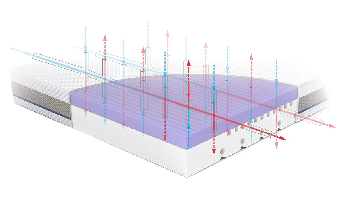 Der Bezug aus Netzstoff und die vertikalen und horizontalen Kanäle sind vollständig integriert - dadurch entsteht ein erweitertes Netz und die Matratze atmet.