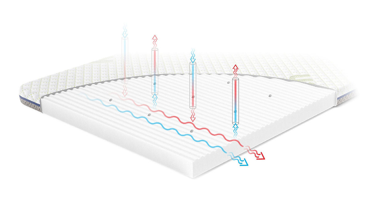 Der Bezug und die vertikalen und horizontalen Kanäle sind vollständig integriert - dadurch entsteht ein erweitertes Netz und die Matratze atmet.