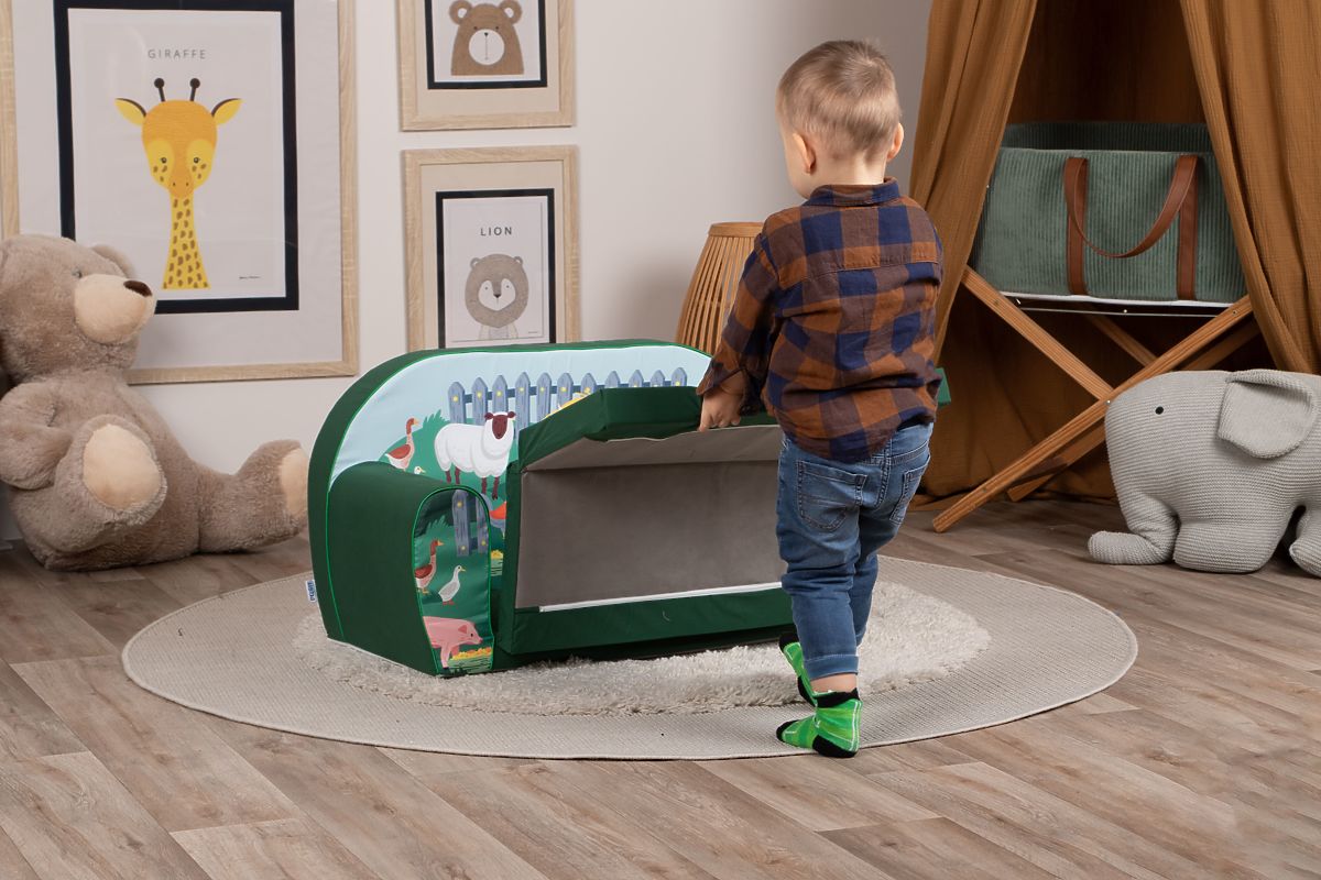 Das Sofa mit fröhlichen Motiven von Kuh, Schaf, Schwein und anderen Tieren verwandelt jedes Kinderzimmer in einen kleinen Bauernhof voller Gemütlichkeit. Dank der weichen Schaumstofffüllung ist es ideal zum sicheren Spielen, Ausruhen oder Lesen der Lieblingsbücher. Der abnehmbare Bezug aus angenehmem und strapazierfähigem Stoff ist pflegeleicht, sodass die Kinder den Komfort genießen können und die Eltern Ruhe haben.