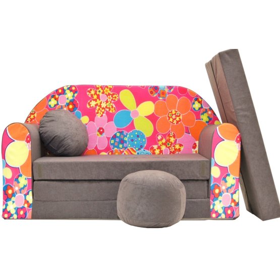Farbenfrohes Kindersofa mit dem Motiv einer blühenden Wiese voller bunter Blumen. Die bunten Farben passen gut zum grauen Bezug. Das Sofa kann sowohl zum Entspannen als auch zum Märchenschauen oder Spielen genutzt werden. Das Sofa ist leicht, sodass das Kind es ohne Hilfe überall hin bewegen kann.