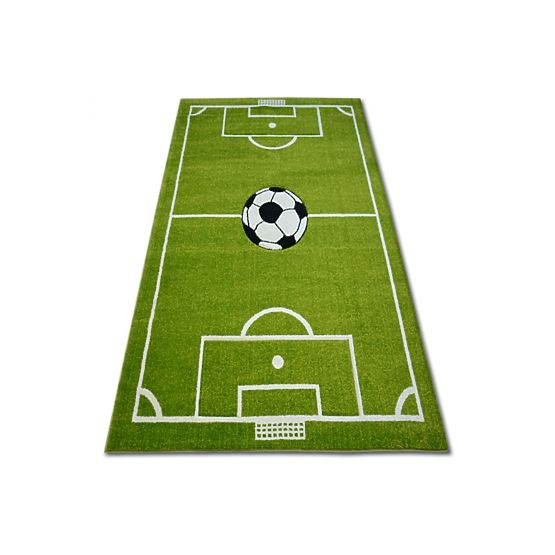 Der Teppich in Form eines Fußballfeldes wird jedem Sportbegeisterten gefallen.