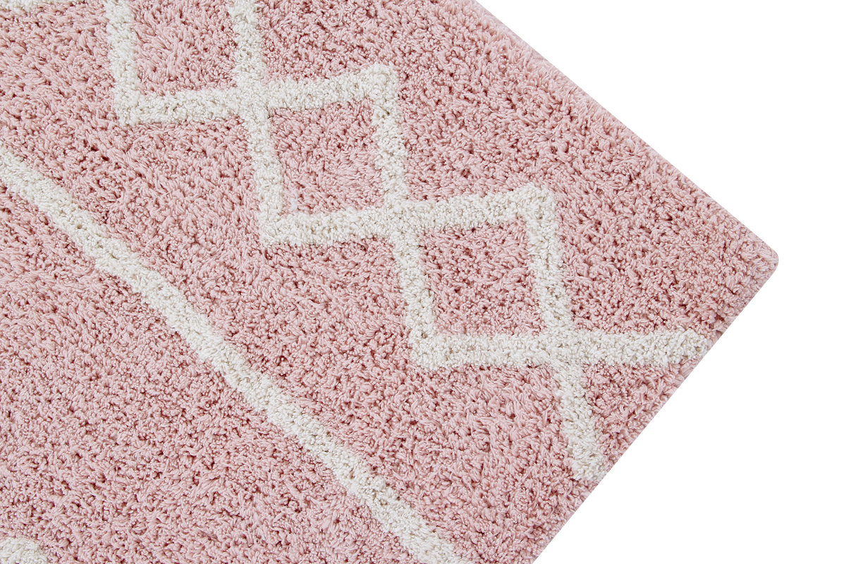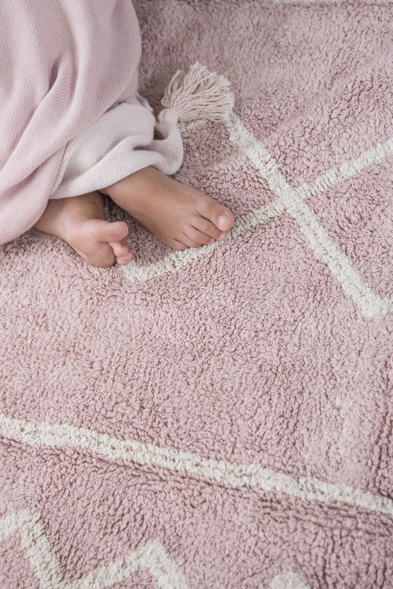 Der handgewebte hochwertige rosa Teppich eines spanischen Unternehmens Lorena Canals ist nicht nur schön und weich, sondern auch sehr praktisch - er schützt das Kind vor dem kalten Fußboden und ist in der Waschmaschine waschbar.