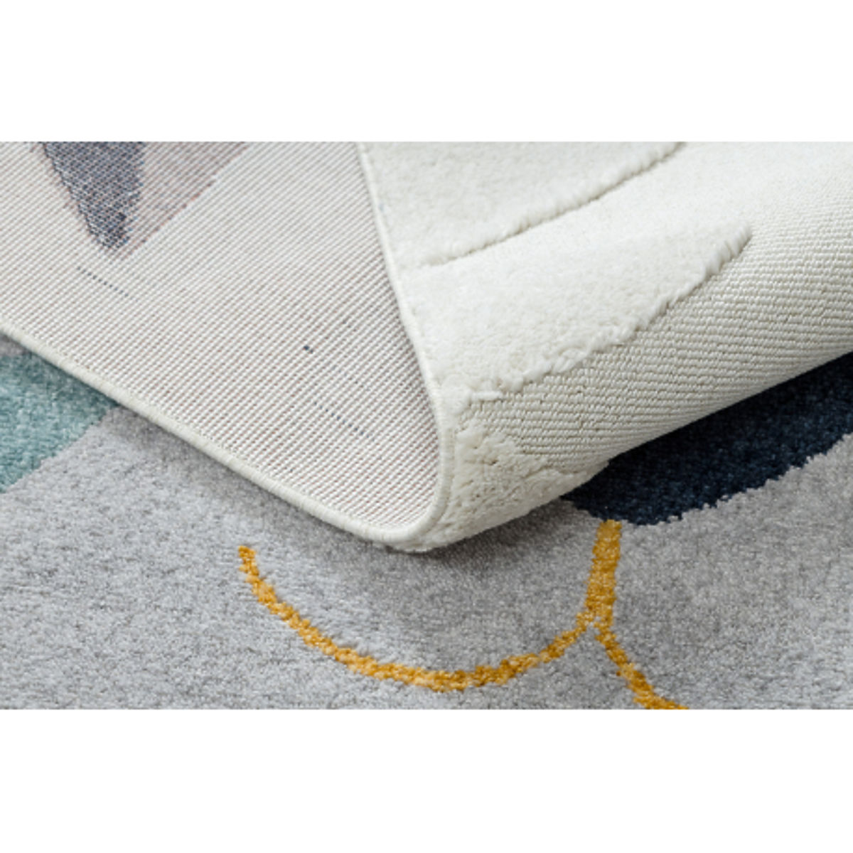Der Teppich hat eine strukturierte Oberfläche mit Fransen, die sowohl das taktile als auch das visuelle Erlebnis unterstützt und die Kreativität und Neugier der Kinder anregt. Dank der hochwertigen Polyesterfaser ist der Teppich weich, leicht und pflegeleicht. Die Dicke des Teppichs variiert zwischen 8 mm und 16 mm, was Komfort beim Spielen und Ausruhen bietet. Das Gewicht hängt vom Muster ab und liegt zwischen 2,0–2,50 kg/m².