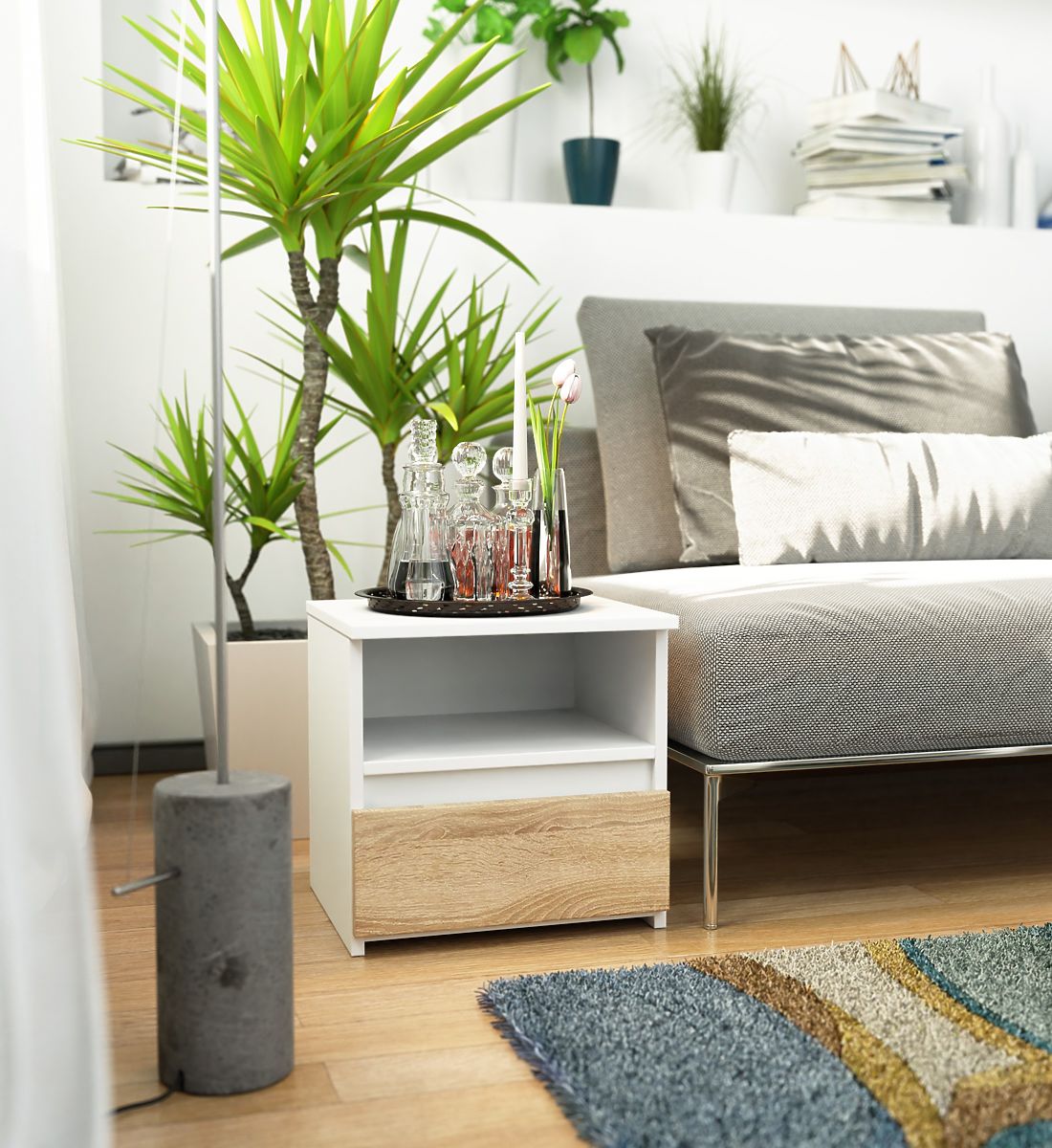 Nachtkommoden sind eine beliebte Art von Möbeln, die neben dem Bett platziert werden. Auf der Platte befindet sich meist eine Lampe, während im Inneren Gegenstände aufbewahrt werden, die Entspannung und Schlaf erleichtern. Personen, die eine elegante Kommode suchen, sollten auf den Nachttisch CL1 40 cm in der Farbe Weiß / Eiche Sonoma achten. Er wird sich in jedem Schlafzimmer schön machen. Er kann auch im Kinderzimmer platziert werden.