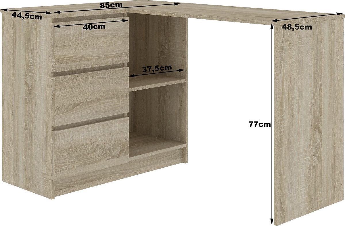 Der Eckschreibtisch mit drei Schubladen ist ein interessantes Angebot für diejenigen, die moderne Büroeinrichtungen bevorzugen. Es ist eine subtile Kombination aus klassischem Weiß und der sehr modischen Farbe Eiche Sonoma. Das Möbelstück besteht aus einem Schreibtisch, zwei offenen Schränken und Schubladen. Das präsentierte Angebot passt gut in jedes Büro, wo eine möglichst funktionale Raumnutzung wichtig ist. Zur Herstellung wurde eine 16 Millimeter dicke laminierte Platte verwendet - ein widerstandsfähiges Material mit hoher Beständigkeit gegen Beschädigungen. Der Eckcomputertisch wird sicherlich auch die anspruchsvollsten Kunden zufriedenstellen, denen sowohl das Aussehen als auch die Qualität und Funktionalität wichtig sind. Wir laden Sie auch ein, weitere Möbel aus dieser Kollektion kennenzulernen - Kommoden, Regale und Schränke, die in der gleichen Farbkombination erhältlich sind. Mit ihnen gelingt es sicherlich, einen geeigneten Raum für Büroarbeit oder Studium zu schaffen - sowohl zu Hause als auch im Büro.