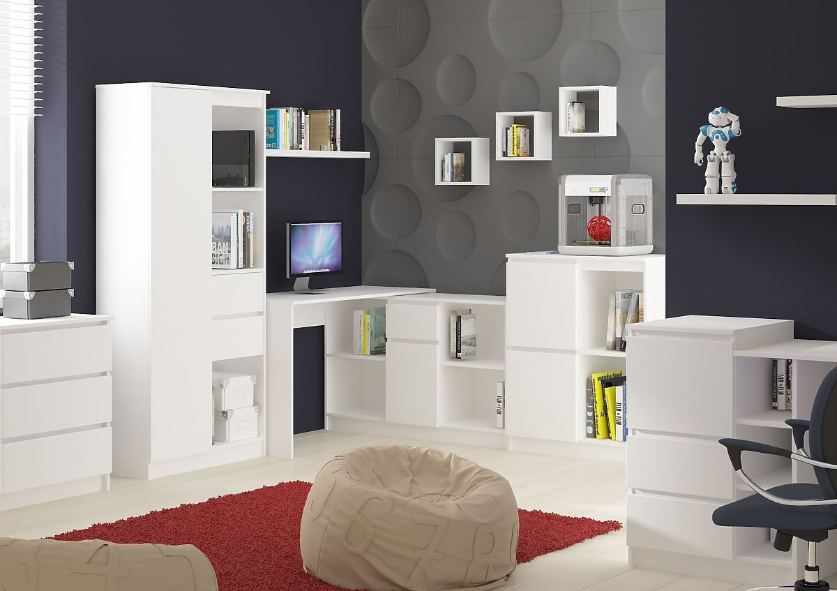 Innovative Lösung. Der Schreibtisch kann mit der Kommode kombiniert werden, um einfach einen Eckschreibtisch zu schaffen. Die Möglichkeit, die Kommode und den Schreibtisch separat zu kaufen, ist ein weiteres Merkmal unserer Möbel. Die Möbel sind universell für rechts- und linkshändige Nutzung geeignet, indem man einfach die Kommode auf die andere Seite des Tisches stellt.