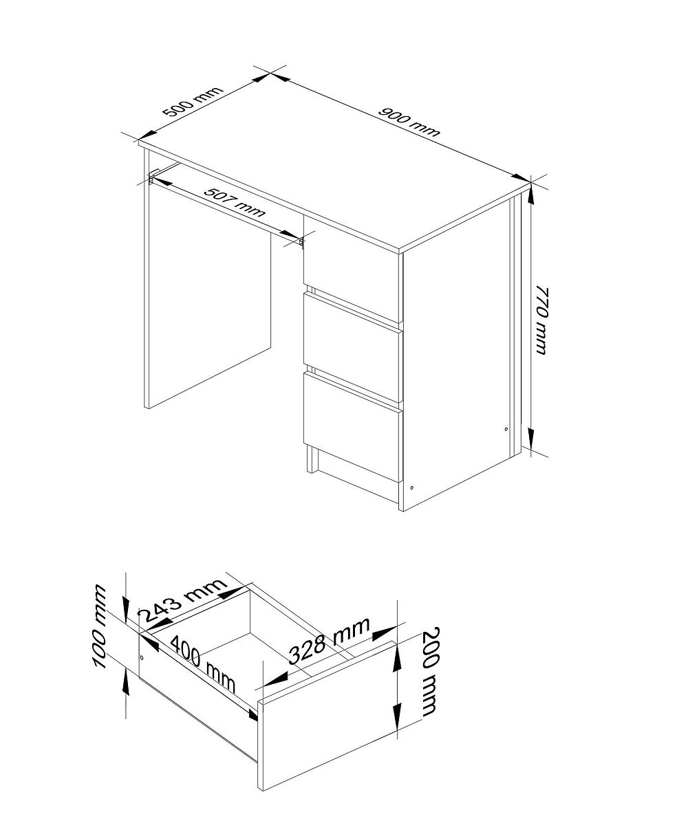 Der Schreibtisch A-6 mit einer Länge von 90 cm, bei dem die Schubladen auf der rechten Seite angeordnet sind, ist zur Selbstmontage vorgesehen. Dies sollte kein Problem darstellen, da die Verpackung eine einfache Anleitung enthält, die eine einfache Montage der Möbel ermöglicht.