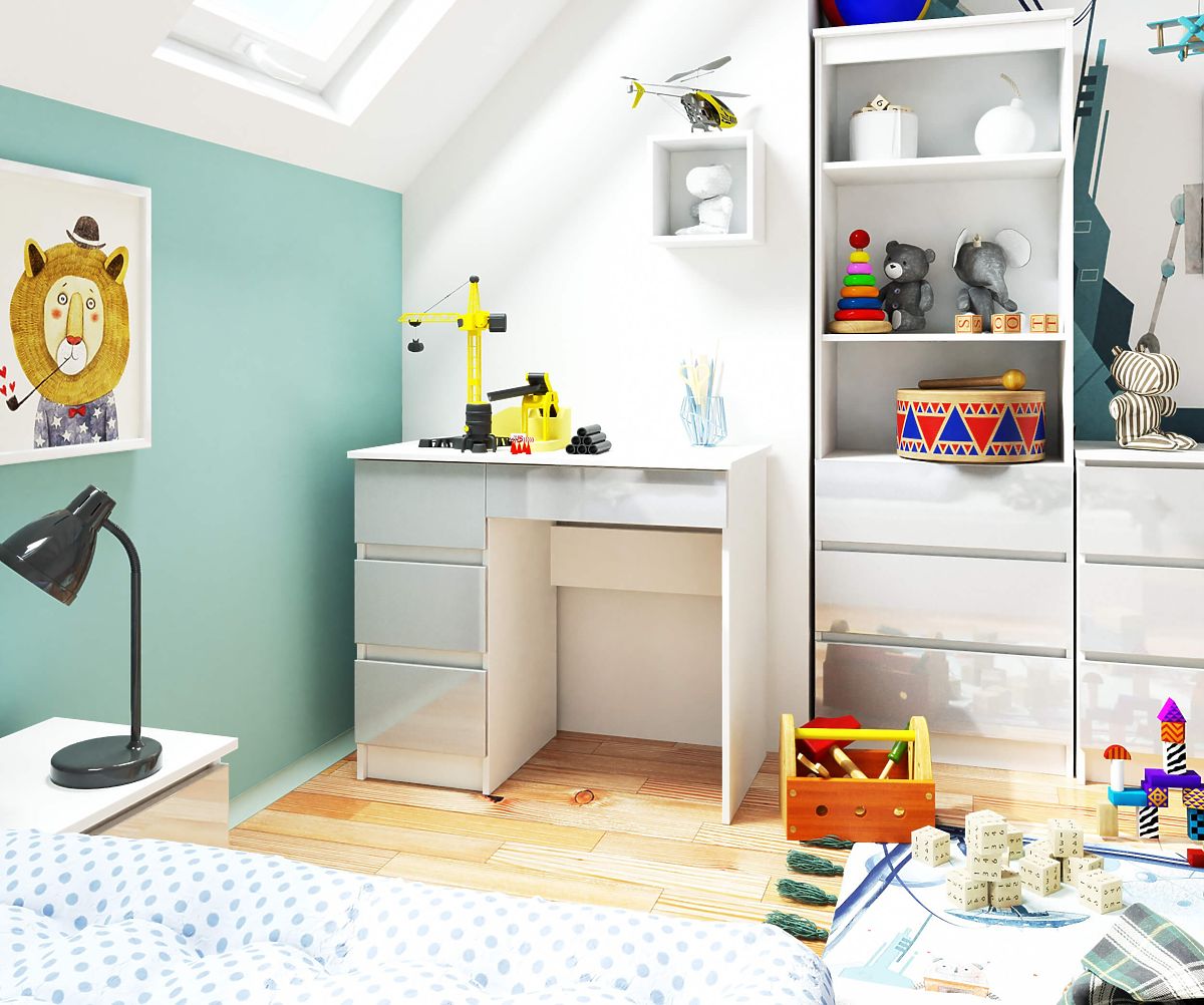 Schreibtisch mit vier Schubladen, der für Jugendliche bestimmt ist.