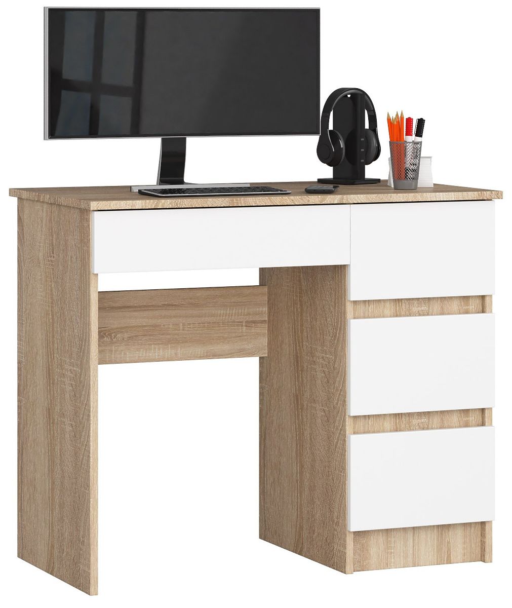 Ein preisgünstiger und dennoch hochwertiger Computertisch, an dem Sie bequem lernen und arbeiten können? Ja, das ist möglich mit dem Angebot unseres Geschäfts, in dem Sie den Computertisch A-7 mit einer Breite von 90 cm in der Farbe Sonoma Eiche und Weiß finden. Es ist ein modernes und zugleich funktionales Möbelstück. Ideal geeignet für das Wohnzimmer, den Aufenthaltsraum, das Jugendzimmer oder das Büro.