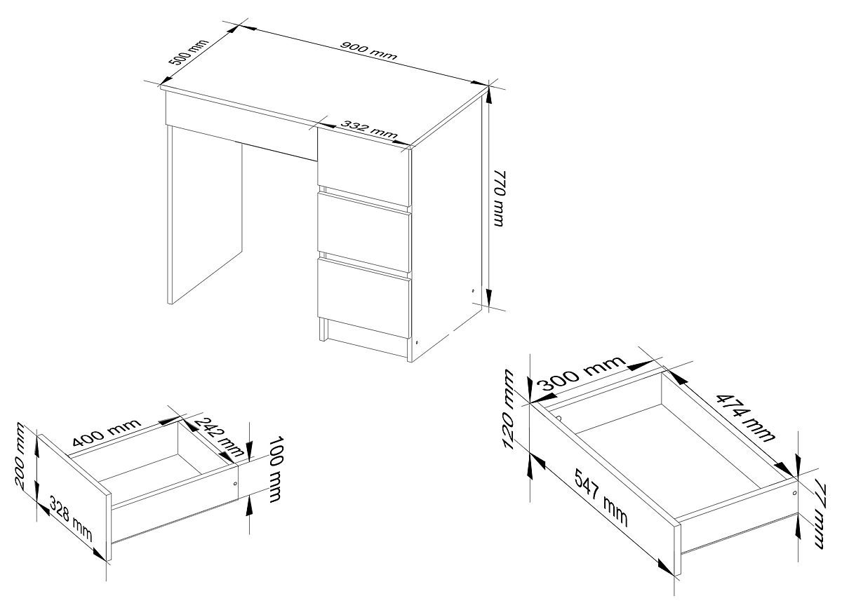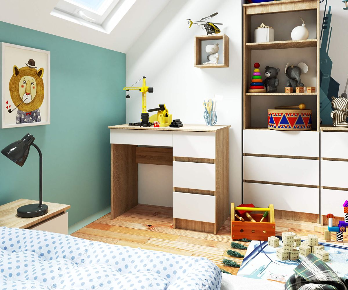 Schreibtisch mit vier Schubladen, der für Jugendliche bestimmt ist.