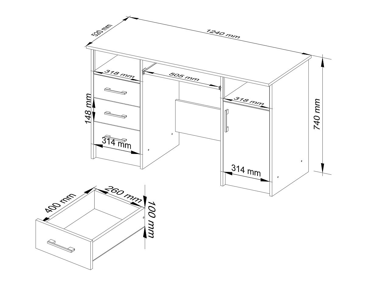 Hergestellt aus abriebfestem laminiertem Plattenmaterial. Die Platte, Seiten und Fronten sind mit ABS-Kante versehen. Verfügt über eine ausziehbare Tastaturablage, 3 Schubladen und eine Tür mit Fronten aus laminiertem Plattenmaterial.