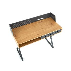 Moderner Schreibtisch mit elegantem Design, das goldene Eiche und Schwarz kombiniert. Er ist aus furniertem MDF und pulverbeschichtetem Stahl gefertigt, was hohe Qualität und Haltbarkeit gewährleistet. Ideal für das Home Office oder die Arbeitsecke.
