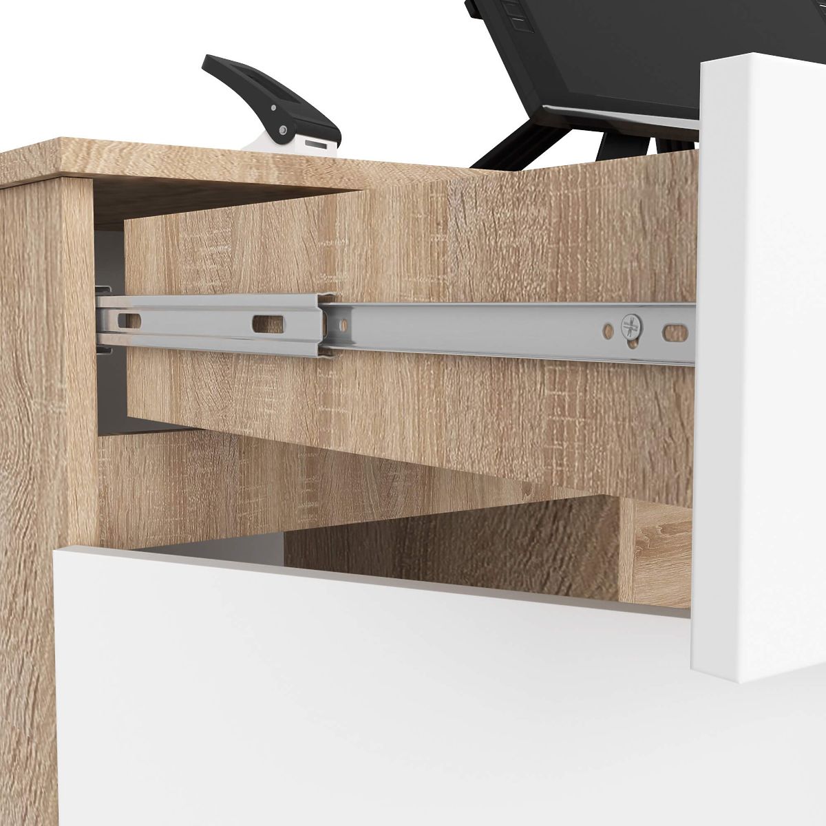 - Schubladen und Tastaturablage bewegen sich auf Metallkugelführungen