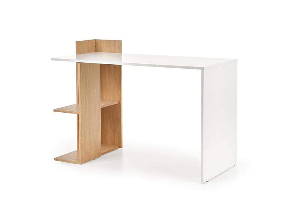 Moderner Schreibtisch in Kombination aus goldener Eiche und Weiß, ideal für das Home-Office oder den Studienbereich. Hergestellt aus hochwertiger laminierten Möbelplatte, bietet er einen eleganten und praktischen Arbeitsbereich.